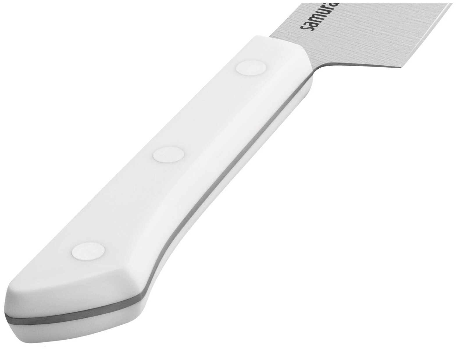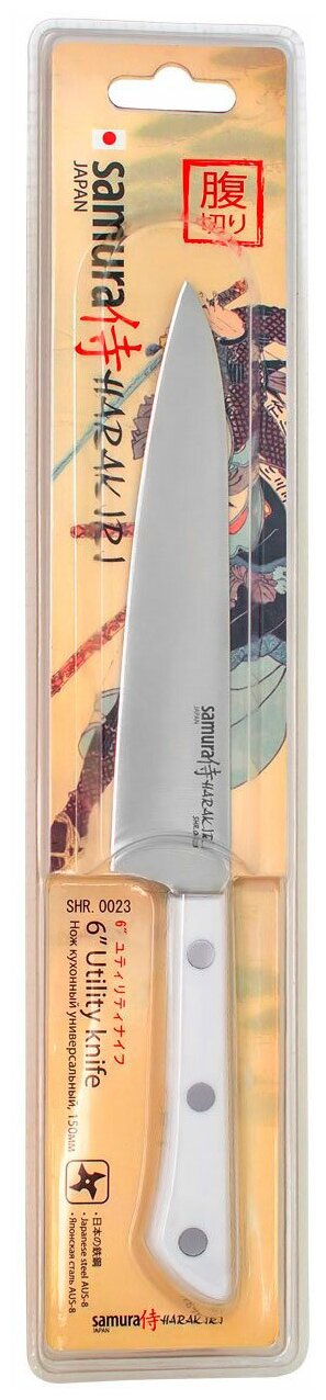 Универсальный нож из коллекции Samura Harakiri чрезвычайно надёжный и долговечный инструмент. При его изготовлении использованы первоклассные современные материалы – высококачественный ABS-пластик для рукояти и сталь AUS-8 для клинка. Как и положено универсальному ножу, этот инструмент прекрасно справляется с очищением и нарезкой фруктов, овощей или колбасы, подготовкой ингредиентов для салата и прочими операциями с небольшими мягкими продуктами без костей. Даже интенсивное ежедневное использование не способно быстро вывести из строя отличный универсальный нож Samura Harakiri!