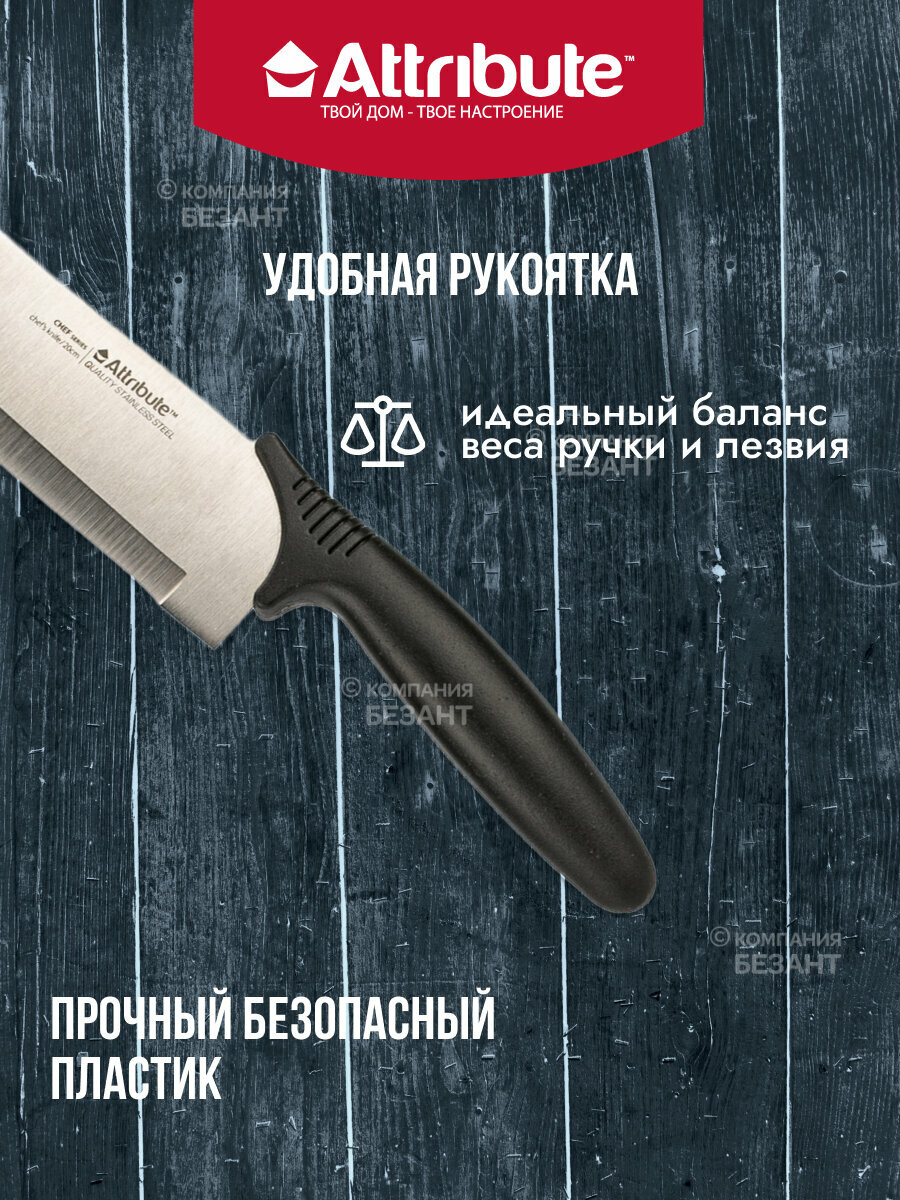 Поварской нож Attribute Knife Chef применяется для нарезки, шинковки, измельчения любых продуктов. Оснащен пластиковой рукояткой. Остроконечное лезвие выполнено из высококачественной нержавеющей стали. Такой нож пригодится на каждой кухне. Состав нержавеющая сталь, пластик.