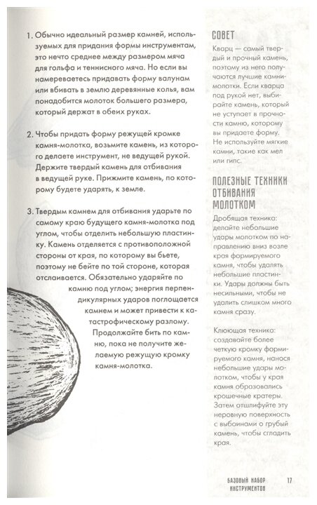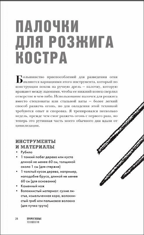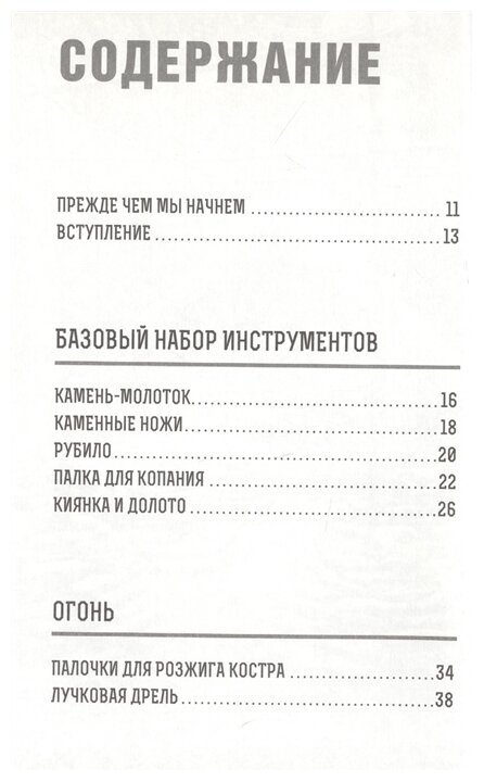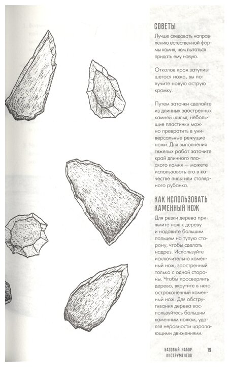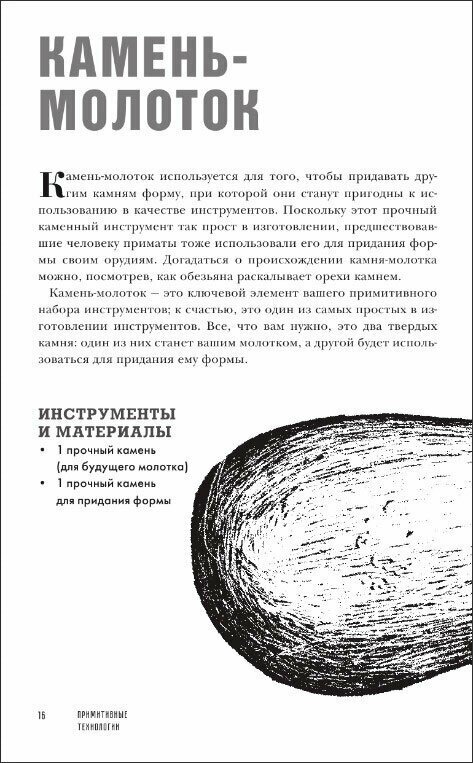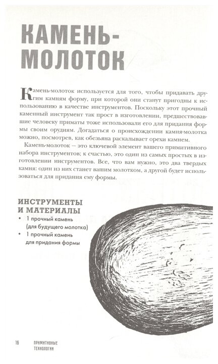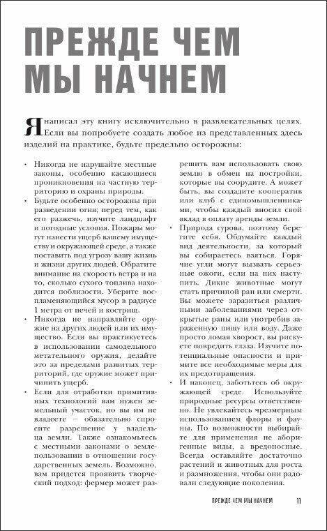В книге множество фотографий и пояснительных рисунков. Следуя им можно попытаться повторить изготовление первобытных орудий труда, охоты и рыбной ловли. Собственно, в книге повторены ролики ютуб-канала автора с таким же содержанием, но книга удобнее более сжатой компоновкой материала. Безусловно, книга эта станет главной и незаменимой для любого детского лагеря и школьного похода