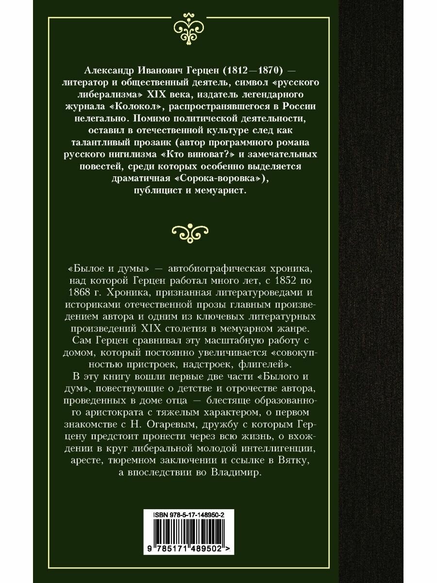 На сегодняшний день товар «Книга: Былое и думы. Детская и университет. Тюрьма и ссылка (Александр Герцен); Издательство АСТ, 1852-1868» можно купить с кешбеком в 5 магазинах: ЛитРес, Читай-город, book24, Яндекс.Маркет, Буквоед