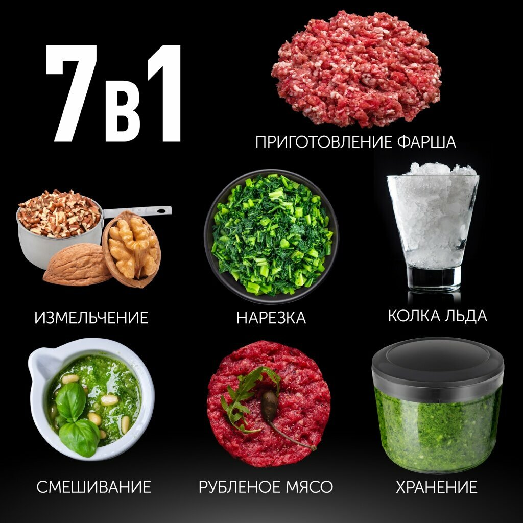 Производителем заявлено 7 основных функций измельчителя: измельчение, нарезка, колка льда, рубленое мясо, смешивание, приготовление фарша и удобное хранение – все что необходимо в процессе приготовления. Последний вариант немаловажен. В комплекте у измельчителя имеется дополнительная крышка, ей можно закрыть чашу, не доставая содержимое оттуда и спокойно убрать в холодильник. Удобно, экономит время, спасает от горы дополнительной грязной посуды. Я посуду мыть не люблю, поэтому довольна такой возможностью)