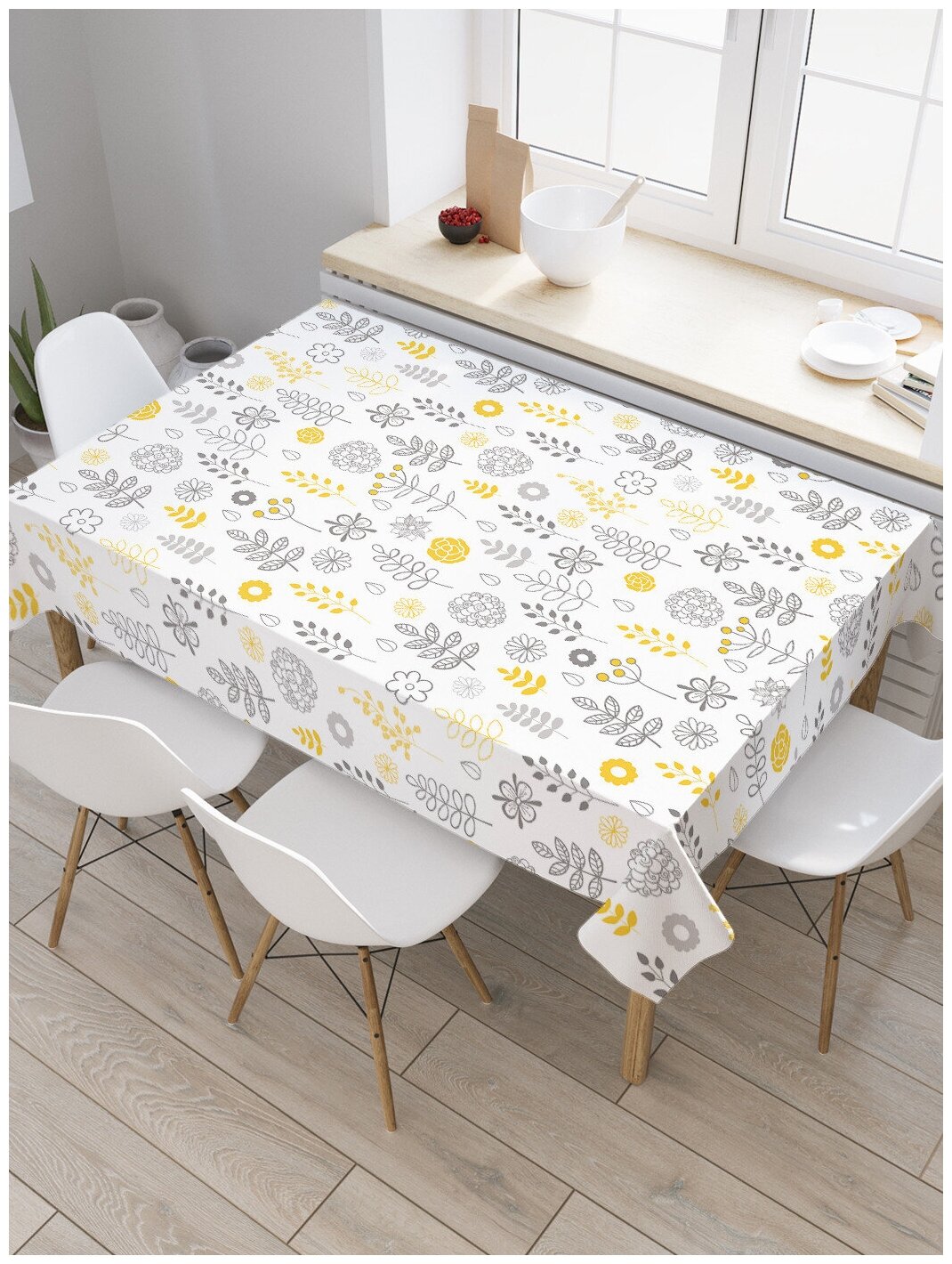 Скатерть, как и клеенка - незаменимая вещь для кухни. Она надежно защищает поверхность стола от грязи, легко стирается и практически не мнется.Материал, из которого сшита скатерть, имеет рельефную текстуру, обладает высокой износостойкостью, идеален для эксплуатации в условиях кухни и выдерживает большое число стирок.