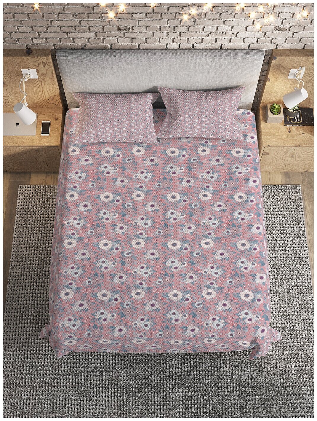 В отличие от обычных, выполненных из ткани жаккард покрывал Евро размера 160x220 см, предлагаемый комплект отличается эксклюзивным внешним видом и особой функциональностью. За счет комбинированной структуры, образованной двумя слоями плотной жаккардовой ткани и расположенным между ними утеплителем из синтепона, стеганое покрывало такого качества при необходимости может использоваться вместо пледа или легкого одеяла. Лицевая часть изделия и дополняющих комплект двух наволочек размером 50х70 см, кроме традиционного для жаккардовой основы узорчатого плетения нитей, украшена цветной декоративной фотопечатью. Внутренняя поверхность оставлена идеально белой. Покрывало с рисунком обладает гипоаллергенными свойствами, и без последствий для внешнего вида способно выдержать множество стирок.