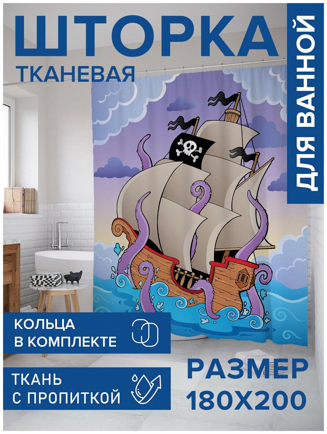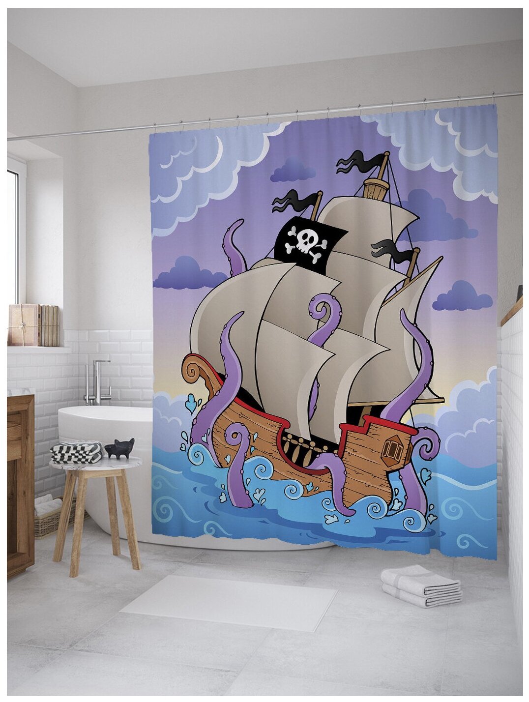 Шторка-занавеска для ванной JOYARTY Штора-занавеска для ванной из сатена с крючками Пиратский корабль с осьминогом 200х180 см (размер: 180х200)