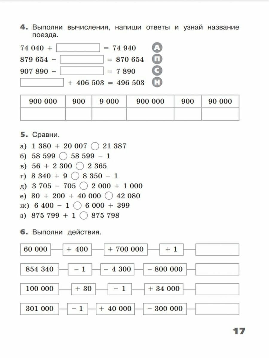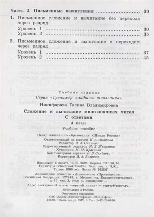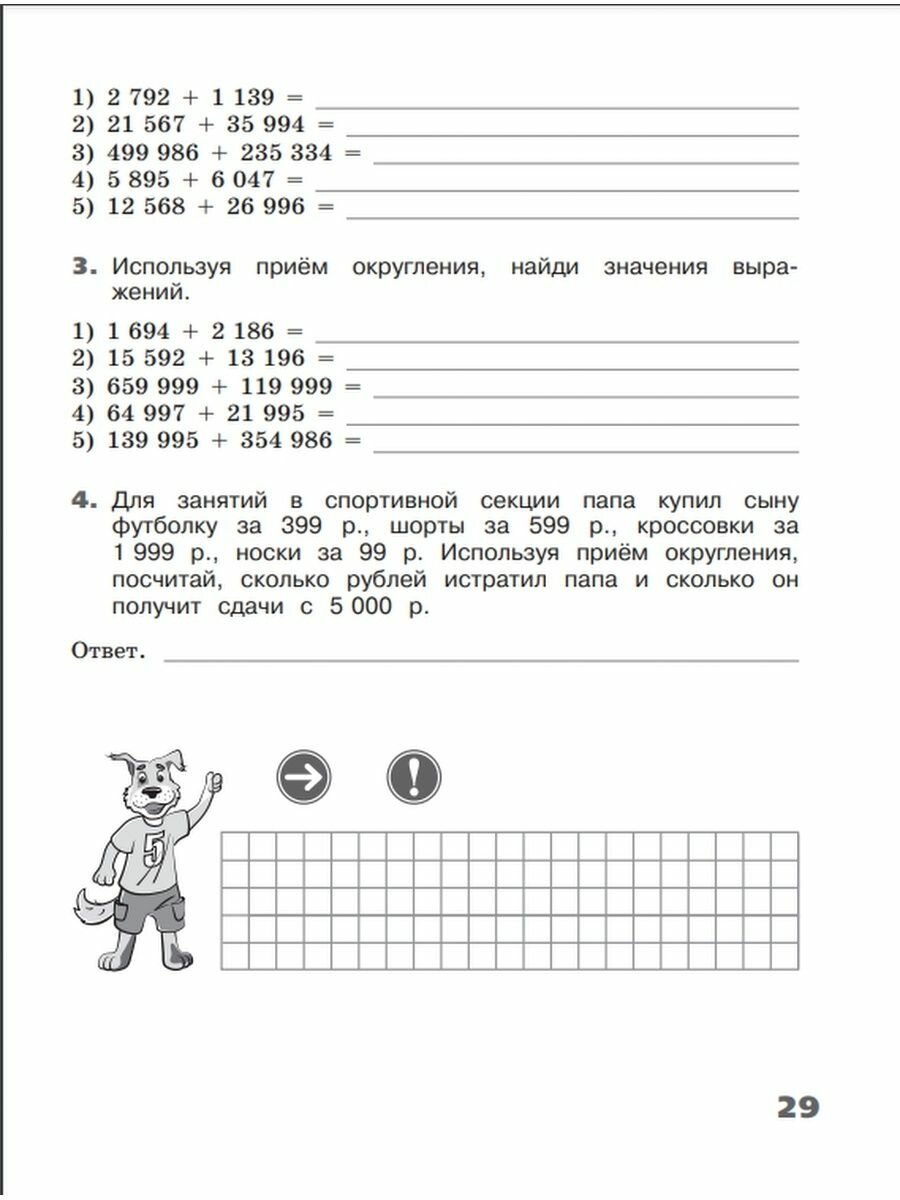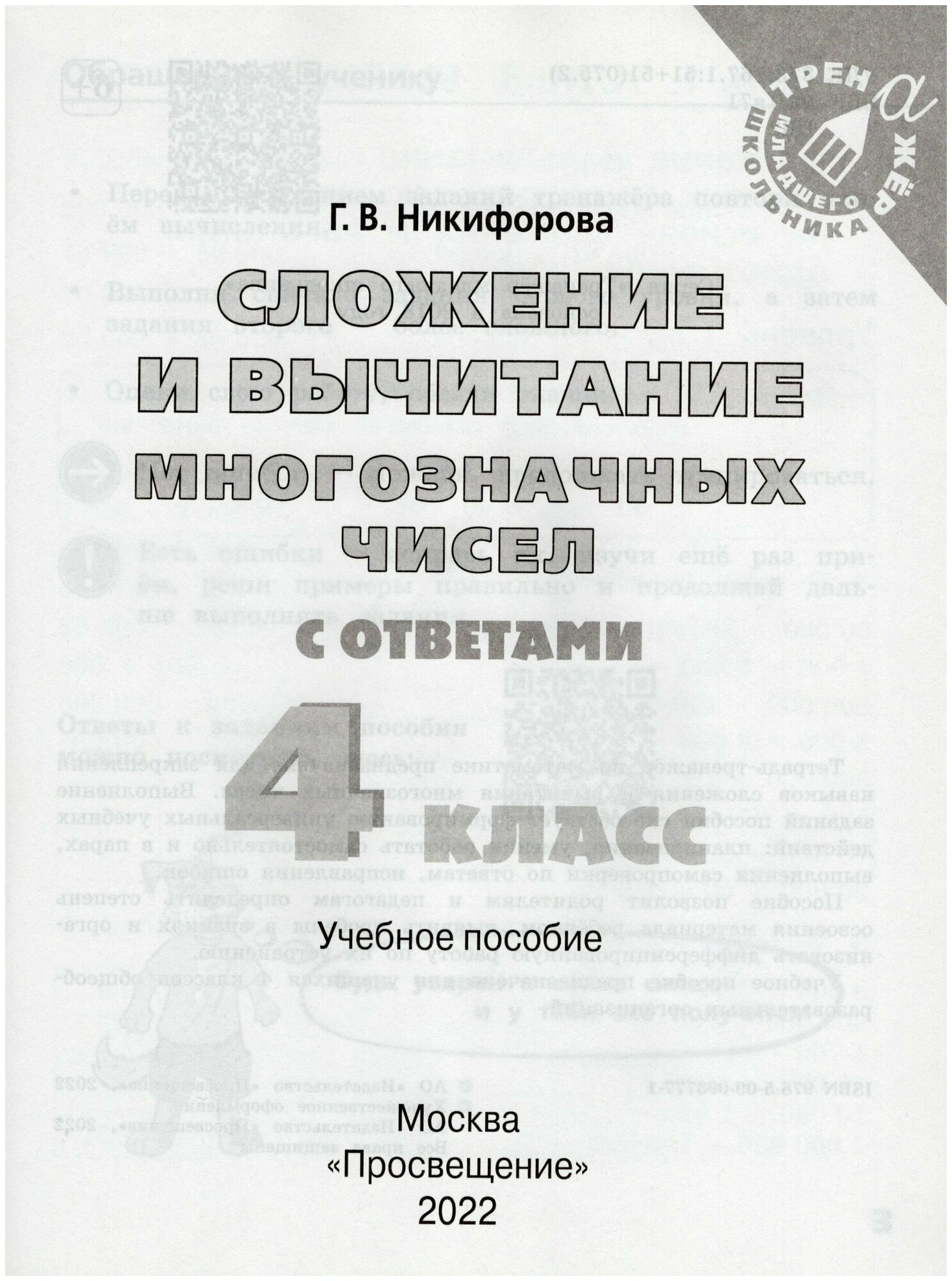 Тетрадь-тренажёр по математике предназначена для закрепления навыков сложения и вычитания многозначных чисел. Выполнение заданий пособия способствует формированию универсальных учебных действий: планированию, умению работать самостоятельно и в парах, выполнению самопроверки по ответам, исправлению ошибок.