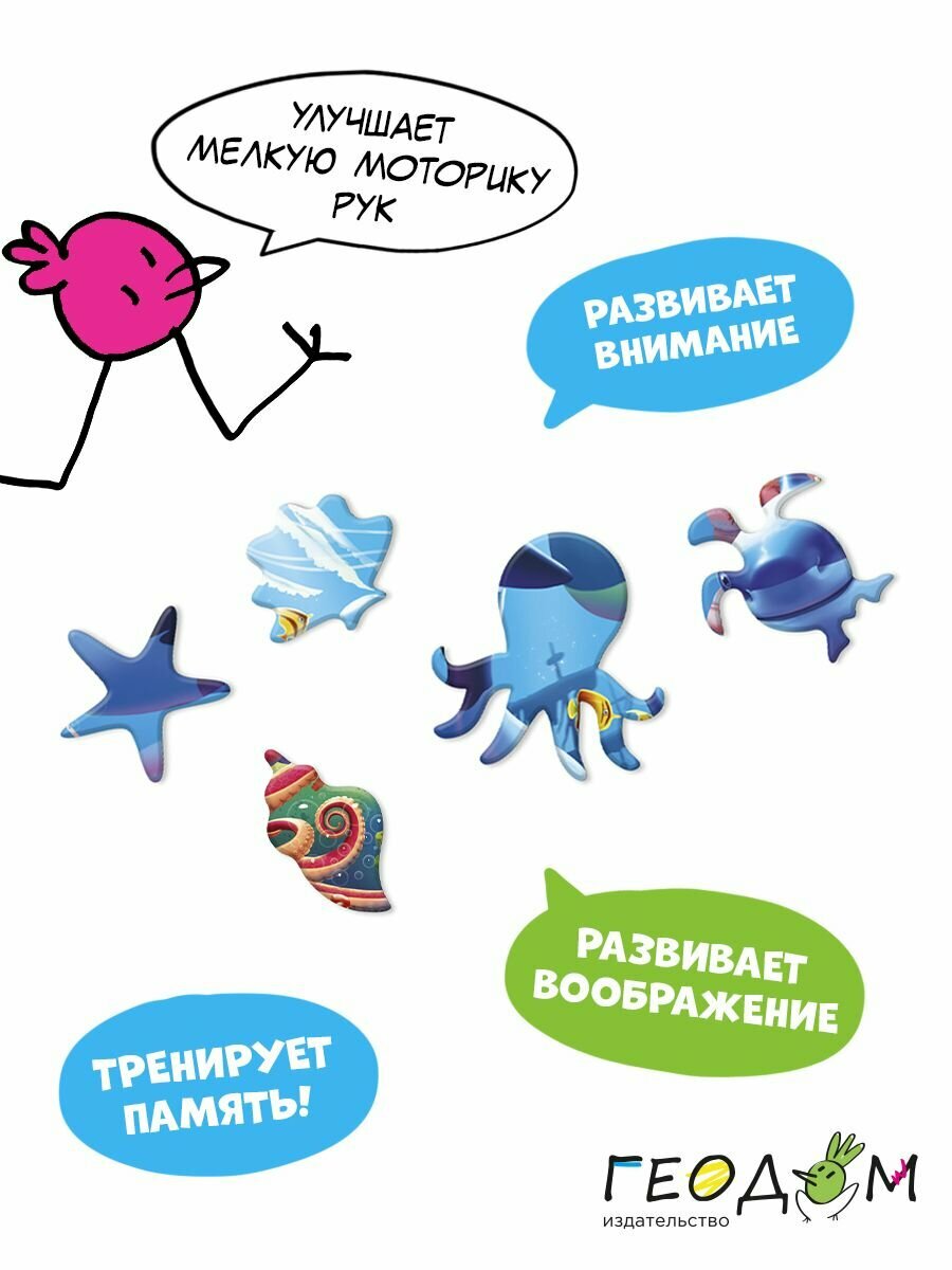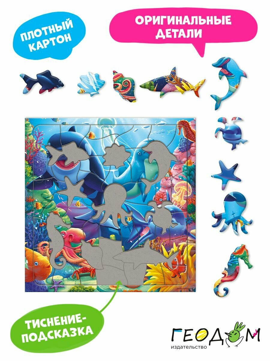 Фигурные пазлы – занимательный досуг для самых маленьких! Кто прячется в глубинах океана? Соберите пазл, чтобы узнать! Элементы пазла – фигурки рыб и других подводных обитателей. Рассматривайте детали, собирайте картинку и изучайте жителей океана! Пазл тренирует мелкую моторику, внимание, память и способствует развитию образного мышления. А благодаря рамке и фрагментам из плотного картона пазл удобно хранить и брать с собой.