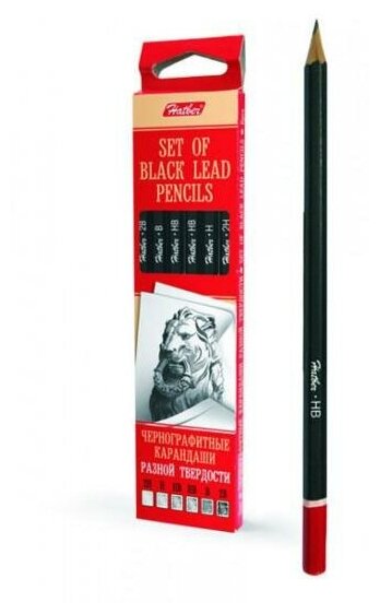 В наборе 6 карандашей твердостью 2H, H, HB, HB, B, 2B.