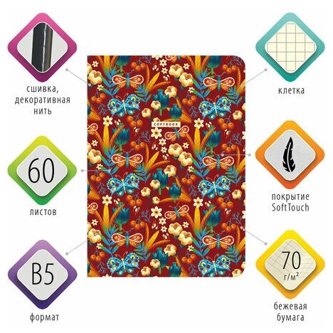 Общая тетрадь формата B5 содержит 60 листов с линовкой в клетку. Сшивка плотно соединяет листы. Обложка изготовлена из высококачественного импортного картона с двусторонней запечаткой, что придает тетради изысканный и неповторимый стиль. Специальное покрытие "SoftTouch" с повышенными тактильными свойствами придает обложке мягкий, бархатистый эффект. Внутренний блок - тонированная офсетная бумага цвета слоновой кости плотностью 70 г/м2.