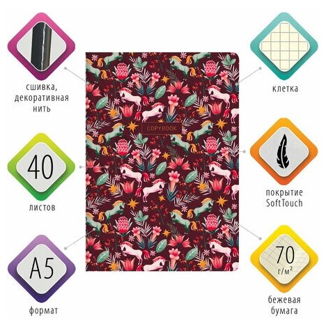 Общая тетрадь формата А5 содержит 40 листов с линовкой в клетку. Сшивка плотно соединяет листы. Обложка изготовлена из высококачественного импортного картона с двусторонней запечаткой, что придает тетради изысканный и неповторимый стиль. Специальное покрытие "SoftTouch" с повышенными тактильными свойствами придает обложке мягкий, бархатистый эффект. Внутренний блок - тонированная офсетная бумага цвета слоновой кости плотностью 70 г/м2.