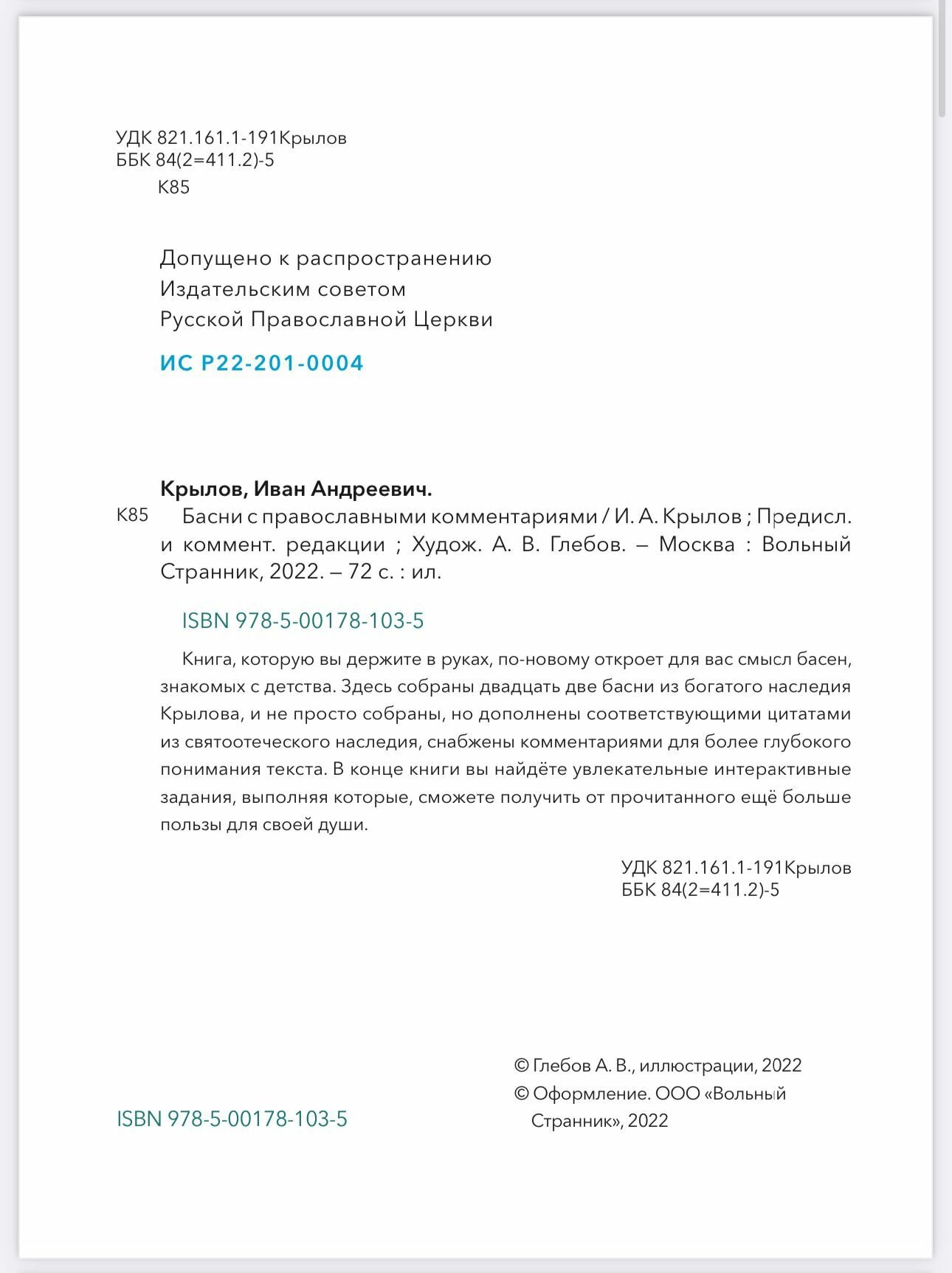 Басни с православными комментариями (Крылов Иван Андреевич, Глебов Александр В. (иллюстратор)); Вольный Странник, 2022