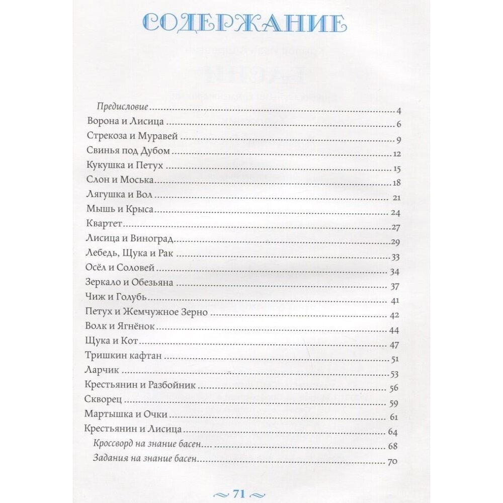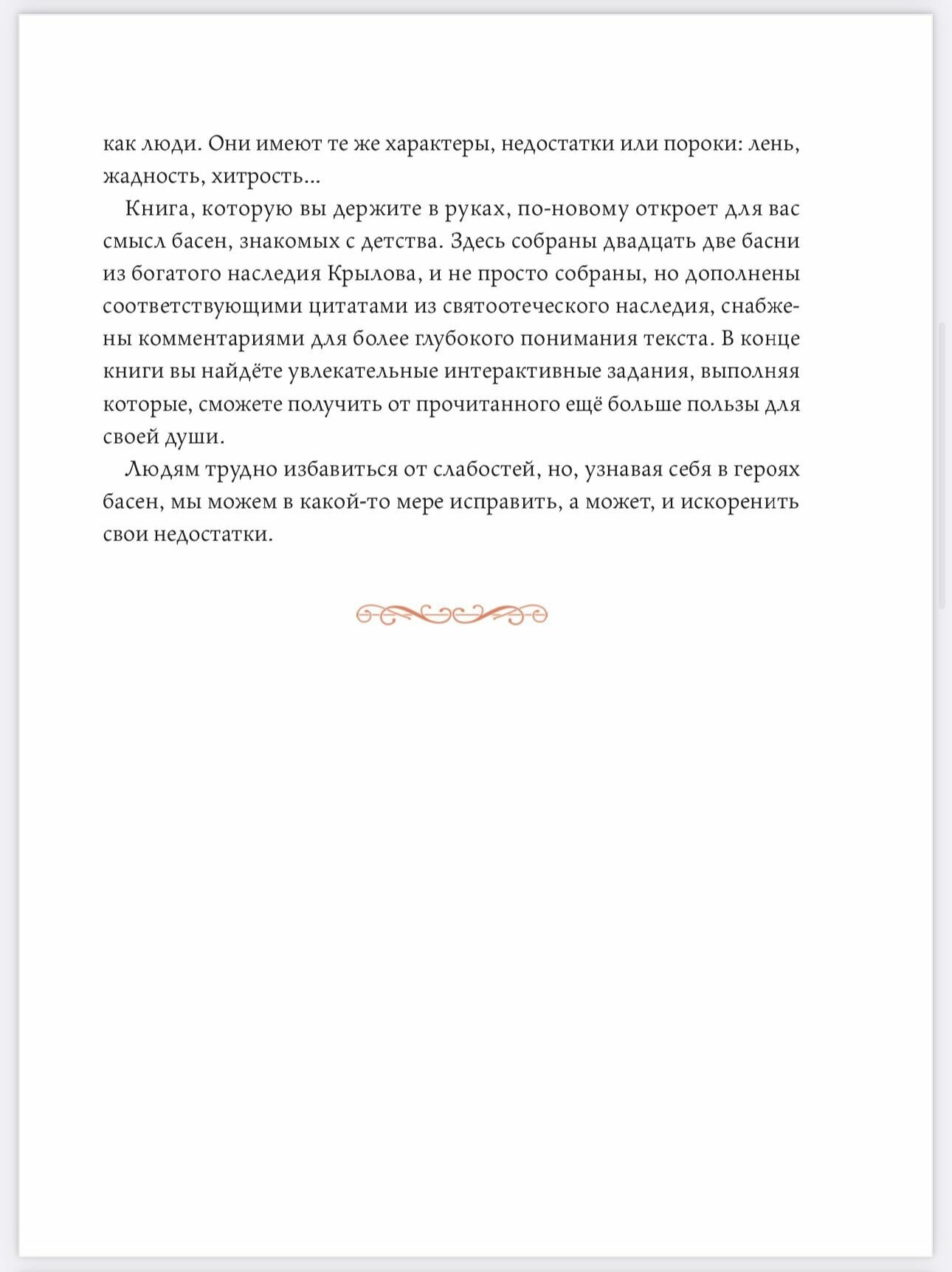 Книга, которую вы держите в руках, по-новому откроет для вас смысл басен, знакомых с детства. Здесь собраны двадцать две басни из богатого наследия Крылова, и не просто собраны, но дополнены соответствующими цитатами из святоотеческого наследия, снабжены комментариями для более глубокого понимания текста. В конце книги вы найдёте увлекательные интерактивные задания, выполняя которые, сможете получить от прочитанного ещё больше пользы для своей души.