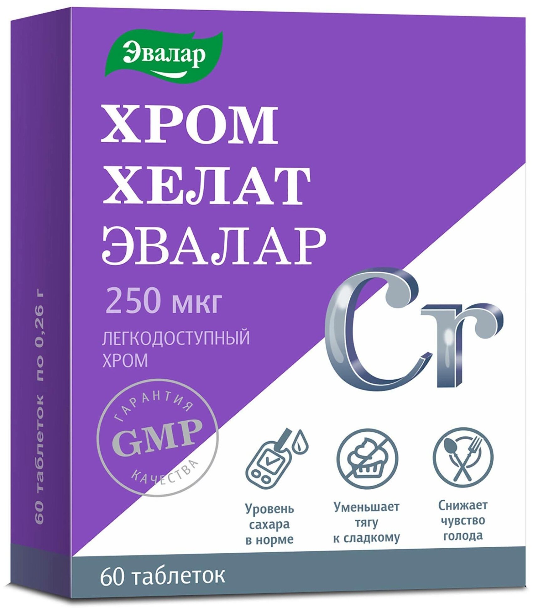 Хром Хелат Эвалар — средство поддерживает нормальный уровень глюкозы. Уменьшает тягу к сладкому и мучному, нормализует обмен липидов и углеводов. Снижает риск возникновения ожирения. Таблетки легко проглатываются, быстро усваиваются и не вызывают чувства тяжести. В упаковке — 60 штук.Не является лекарственным средством. Перед применением рекомендуется проконсультироваться с врачом. Имеются противопоказания.