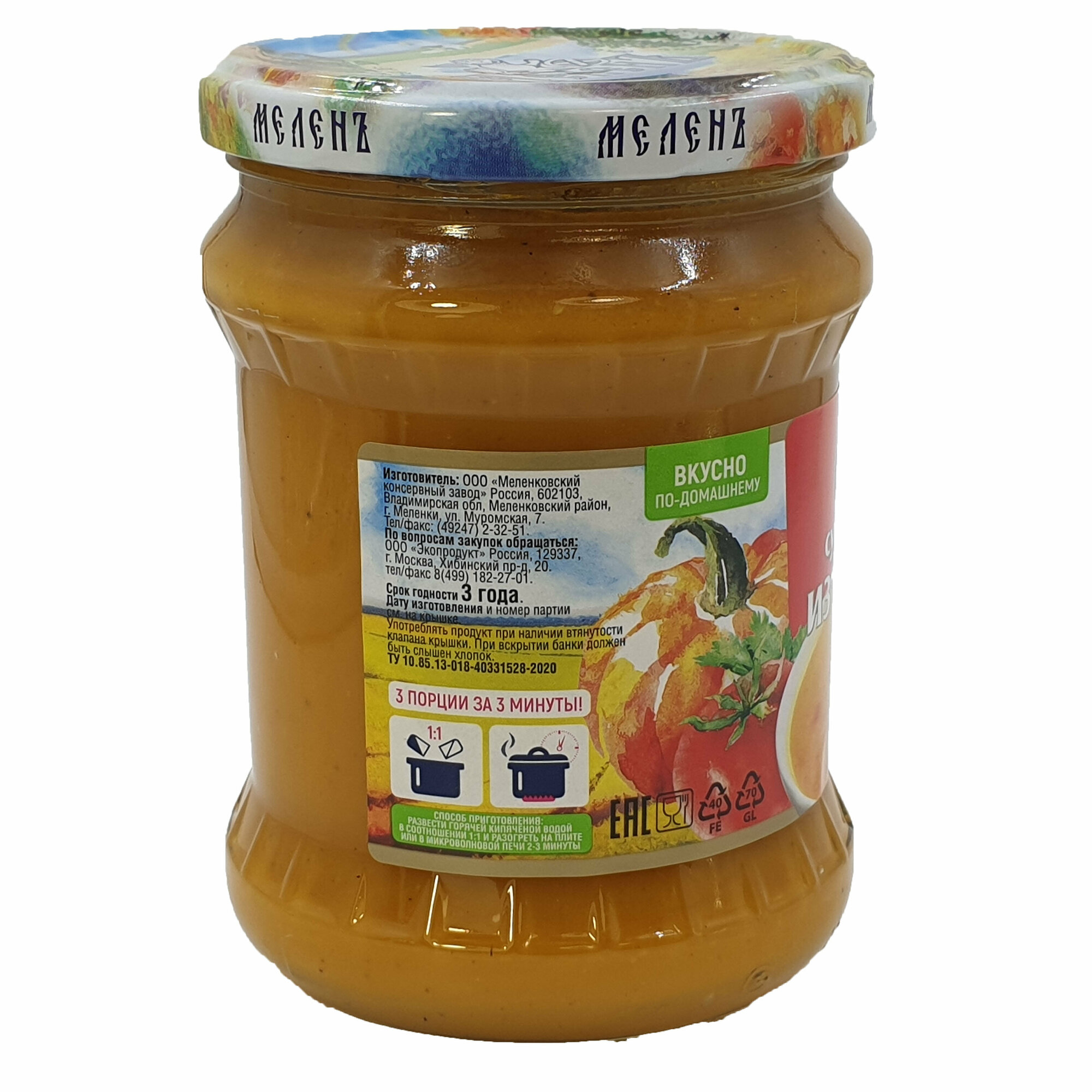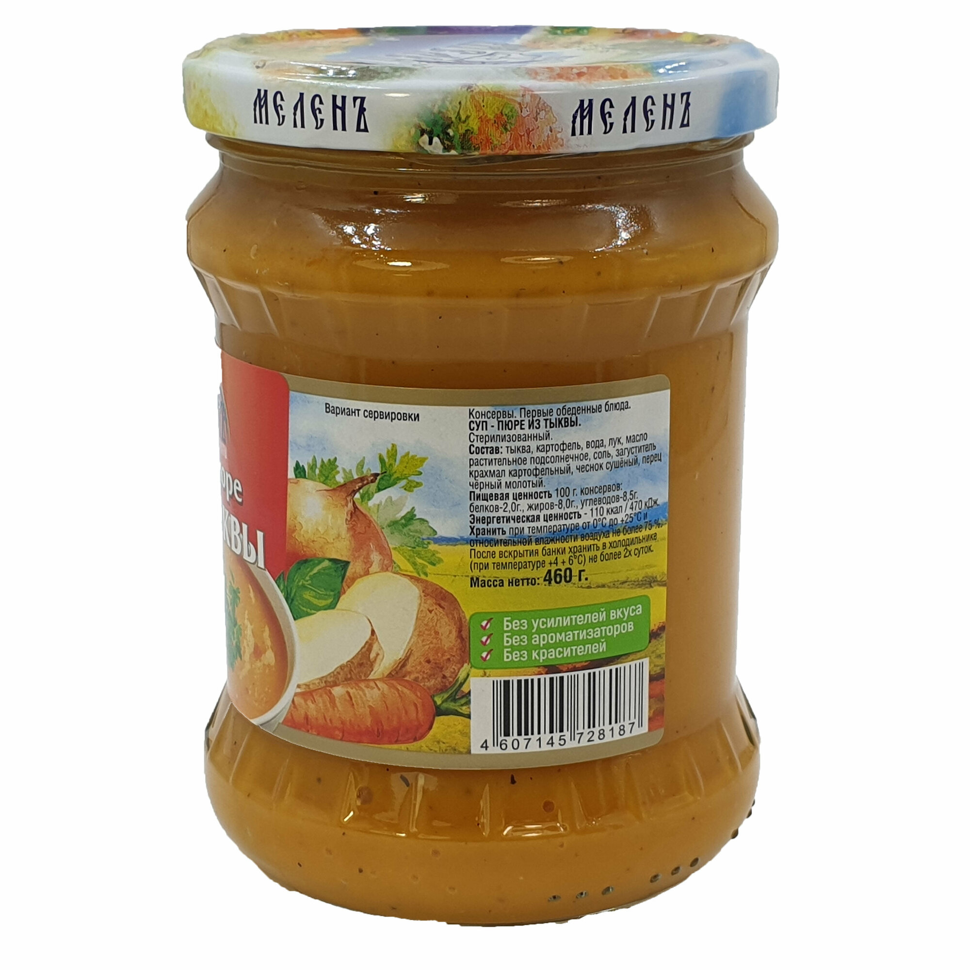 | Состав | Тыква, картофель, вода, лук, масло растительное подсолнечное, соль, загуститель крахмал картофельный, перец черный молотый. |