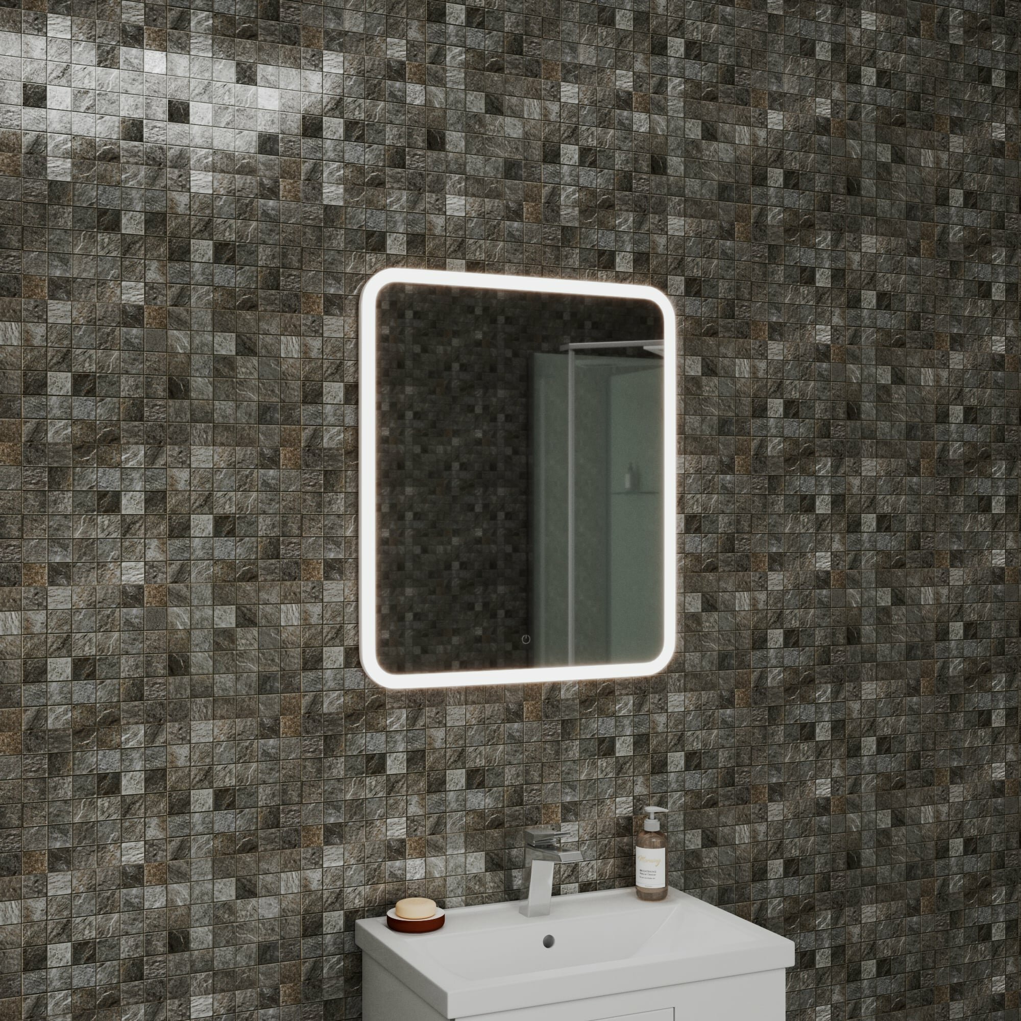 Светодиодное зеркало CAMILA 600х700 изготовлено из зеркального полотна толщиной 4 мм. В качестве элемента LED-подсветки используется светодиодная лента с плотностью диодов 120 шт./м мощностью 9,6Вт/м. Электрические компоненты размещены внутри корпуса из высококачественного УПС-пластика. Край полотна обработан еврокромкой. Управление подсветкой осуществляется при помощи сенсорной кнопки, вынесенной на лицевую панель. Зеркало поставляется в комплекте с настенным крепежом.