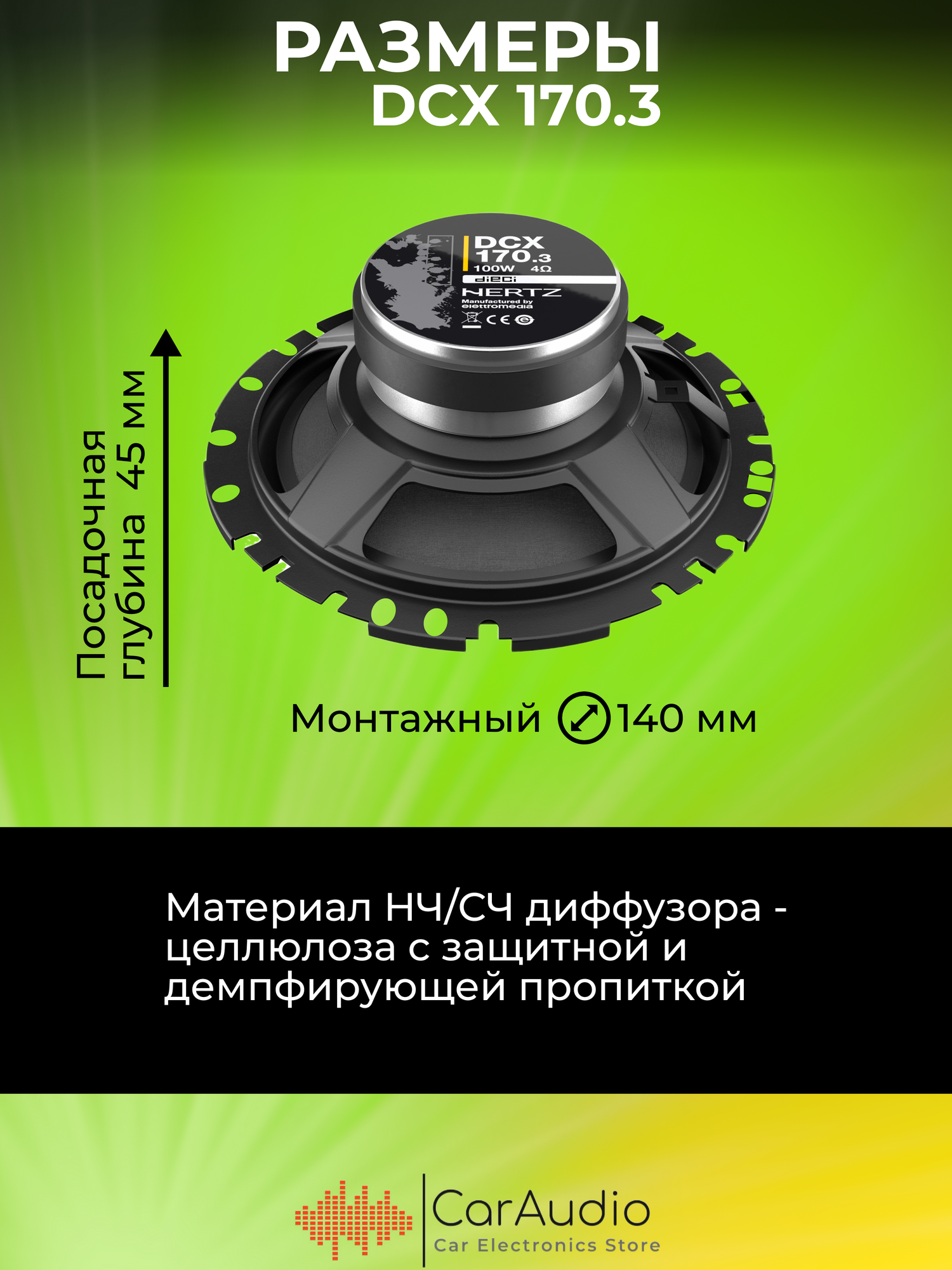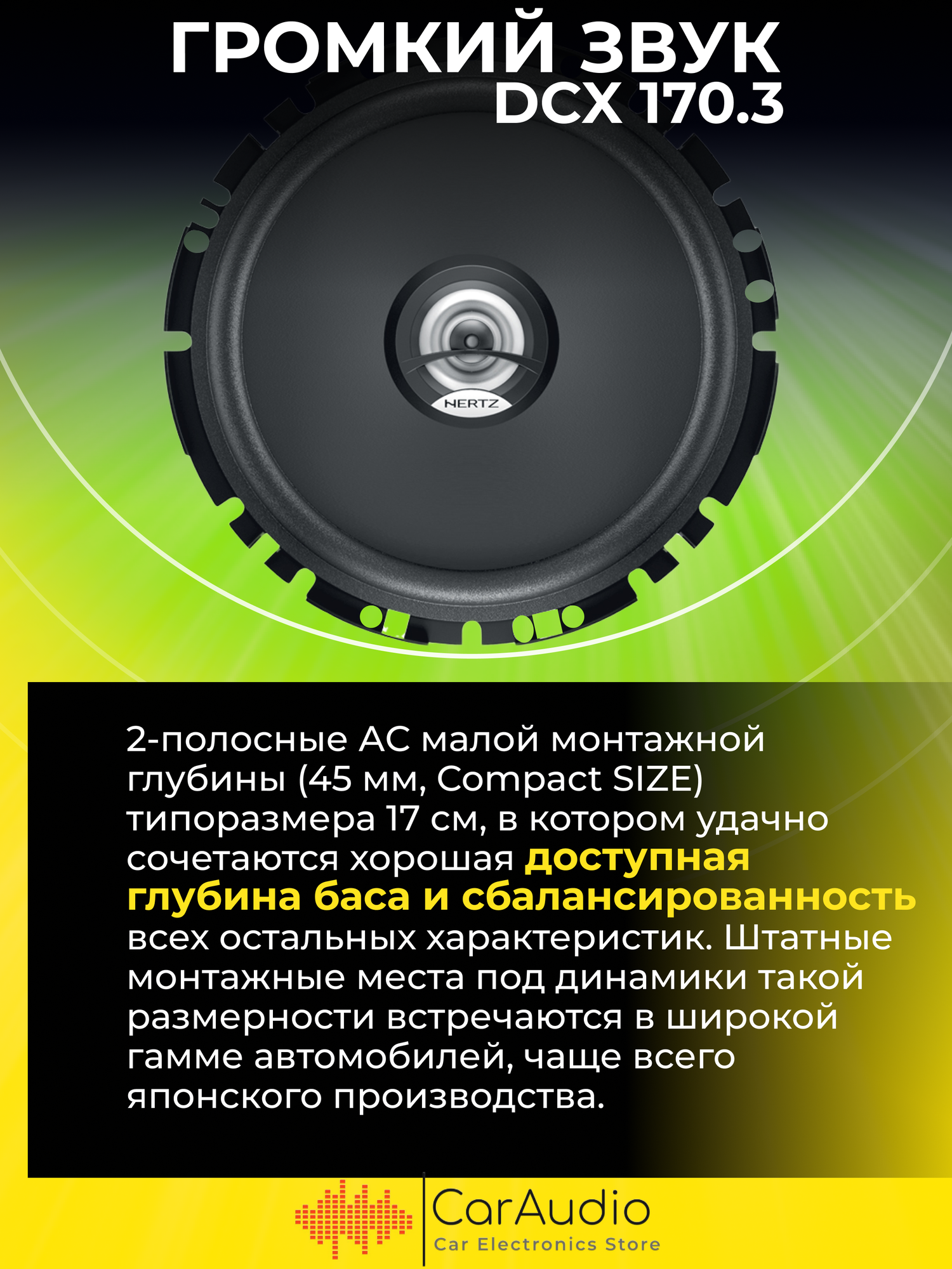 2-полосные АС малой монтажной глубины (45 мм, Compact SIZE) типоразмера 17 см, в котором удачно сочетаются хорошая доступная глубина баса и сбалансированность всех остальных характеристик. Штатные монтажные места под динамики такой размерности встречаются в широкой гамме автомобилей, чаще всего японского производства. Помимо компактности тыльной части, универсальности установки способствуют множественные крепежные отверстия на монтажном фланце, а также расположение ВЧ-звена по высоте в пределах габаритов динамика. Отличная чувствительность позволяет получить громкое звучание даже с маломощными головными устройствами. Кроме того, при соблюдении мер правильной установки динамики звучат свободно от искажений во всем широком диапазоне подводимой мощности (50/100 Вт продолжительная/пиковая).