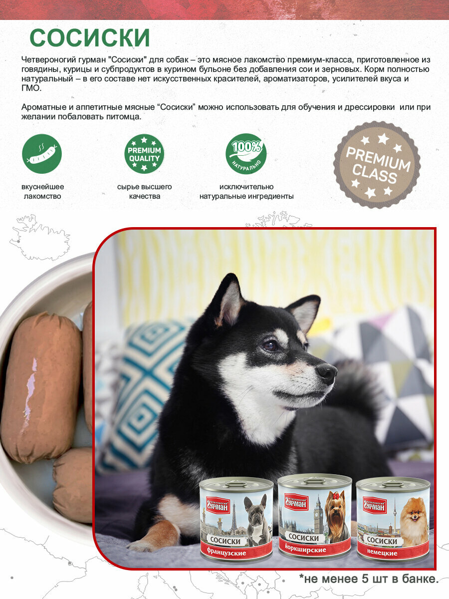 Влажный корм для собак Четвероногий Гурман Сосиски Французские 024 кг ЧЕТВЕРОНОГИЙ ГУРМАН СОСИСКИ ФРАНЦУЗСКИЕ для взрослых собак (240 гр)