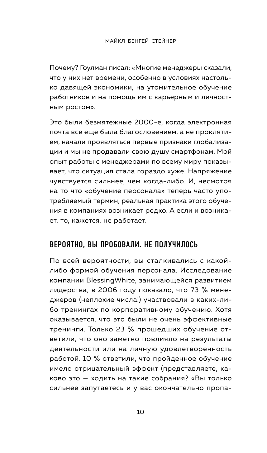 Автор этой книги убежден, что опытному коучу достаточно 10 минут в день, чтобы повысить эффективность своих сотрудников и клиентов. Главное — задавать правильные вопросы. Майкл Бенгей Стейнер, ведущий бизнес-тренер, предлагает методику семи трансформирующих вопросов, благодаря которым ваш стиль управления и консультирования станет продуктивнее.