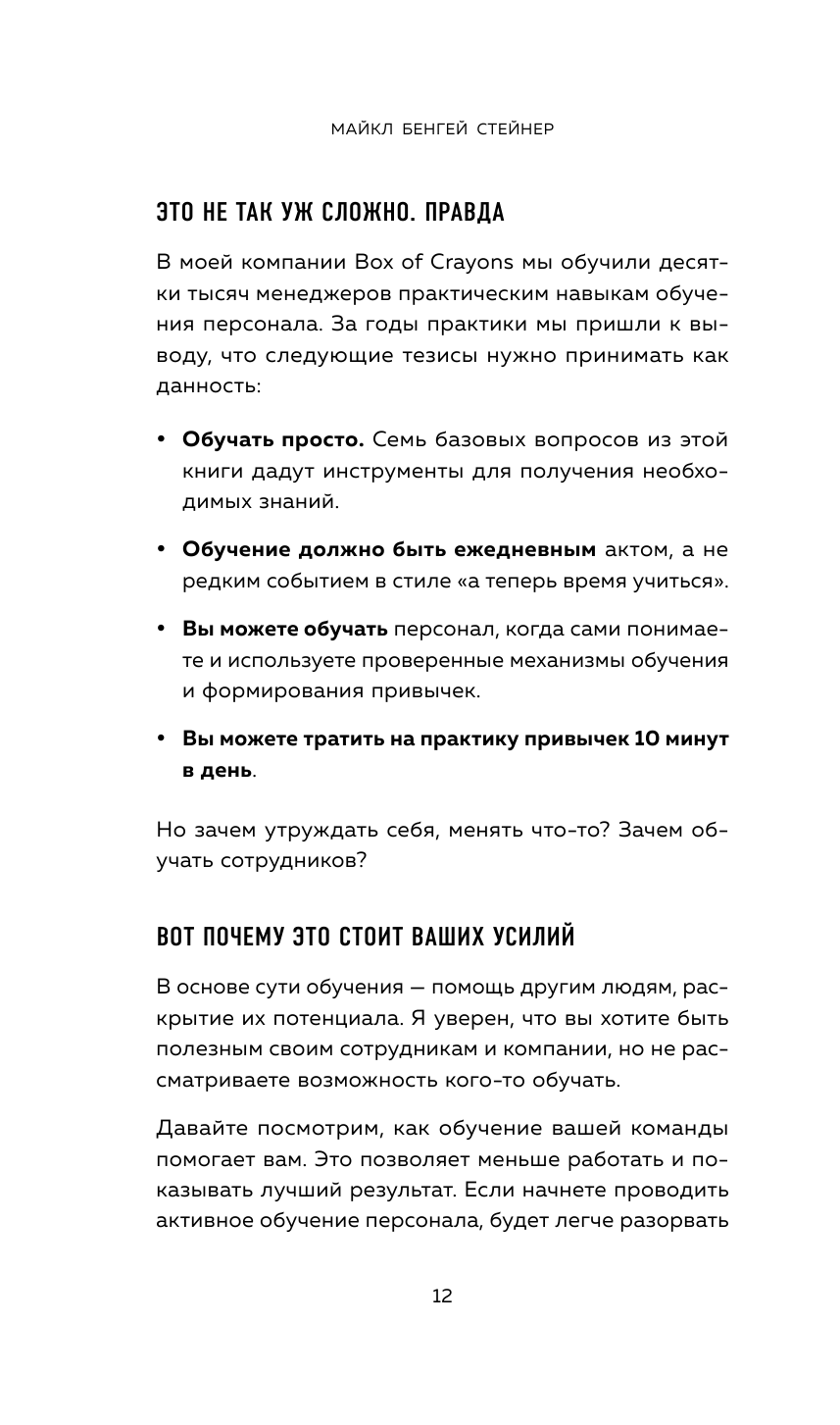 Майкл Бенгей Стейнер — основатель и старший партнер компании Box of Crayons, которая помогает менеджерам и руководителям по всему миру стать более успешными и вдохновляющими лидерами. Лектор TEDx и популярный писатель. Совокупный тираж книг — больше миллиона экземпляров. Имеет ученую степень в Оксфорде.