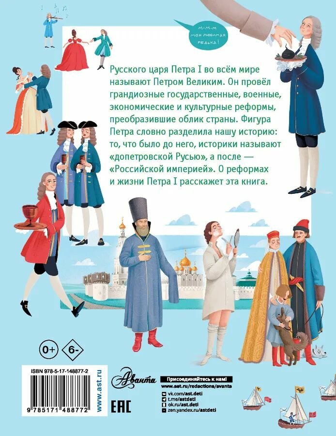 Великолепное издание о Петре Первом для младших школьников. Дивные картинки. Информация есть практически обо всём, что необходимо и любопытно знать (нет только главы про Петровские ассамблеи - было бы интересно почитать!). Думаю, что книжка эта может быть полезна не только малышам, но и средним классам. Шрифт крупный, листы плотные, белые. Подходит как для самостоятельного, так и для совместного со взрослыми чтения.