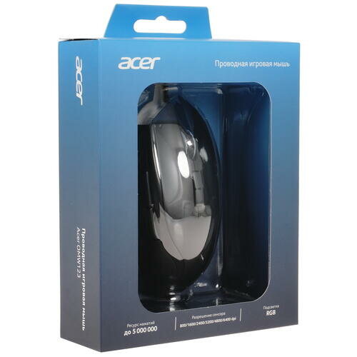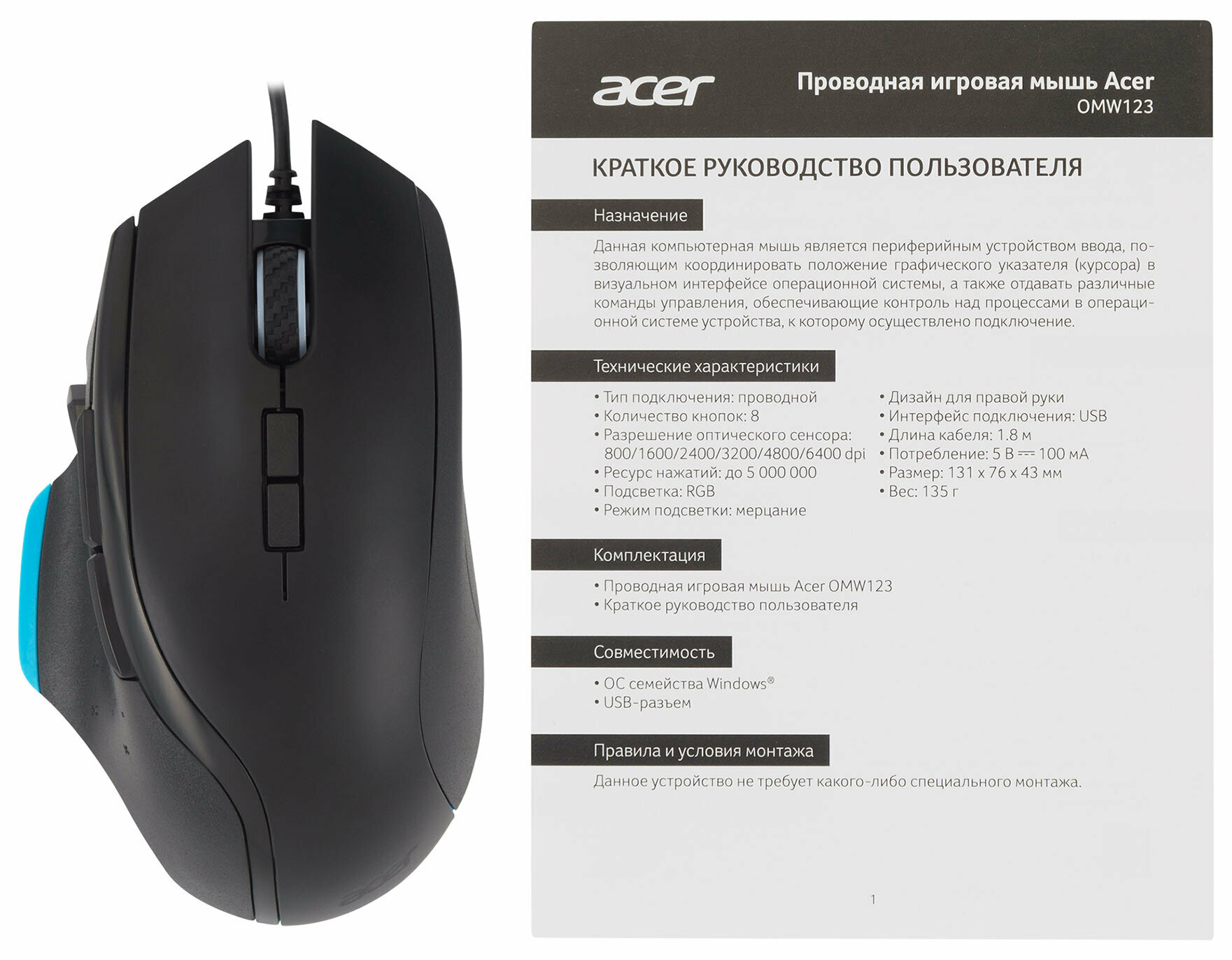 Мышь Acer черный, оптическая, разрешение сенсора 6400dpi, проводная, длина провода 1.8м, кнопок: 6, подходит для правой руки (ZL.MCEEE.00X)