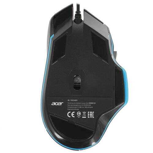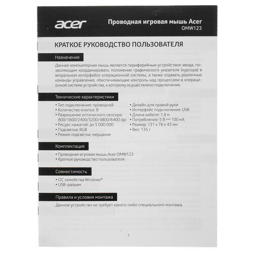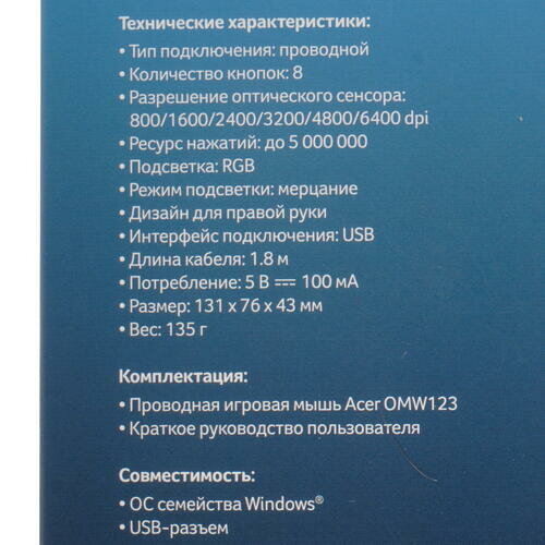 | Прочее | Мышь проводная Acer OMW123 [ZL.MCEEE.00X] имеет черный корпус с привлекательным дизайном и продуманной эргономикой, на котором размещены 8 четко срабатывающих клавиш. Здесь представлены как 3 стандартные клавиши с колесиком прокрутки, так и боковые клавиши для выполнения определенных действий, а также переключатель чувствительности светодиодного оптического сенсора. Сенсор может работать в разрешении 800, 1600, 2400, 3200, 4800 или 6400 dpi и позволяет добиться полного контроля над курсором.,Компьютерная мышь Acer OMW123 [ZL.MCEEE.00X] оборудована 1.8-метровым кабелем с коннектором USB Type-A на конце, за счет которого происходит подключение к порту ПК или ноутбука. Питание к устройству подается по шине, поэтому мышь не нуждается в батарейках для работы. Асимметричный дизайн корпуса мыши позволяет с удобством управлять ею правой рукой. |
