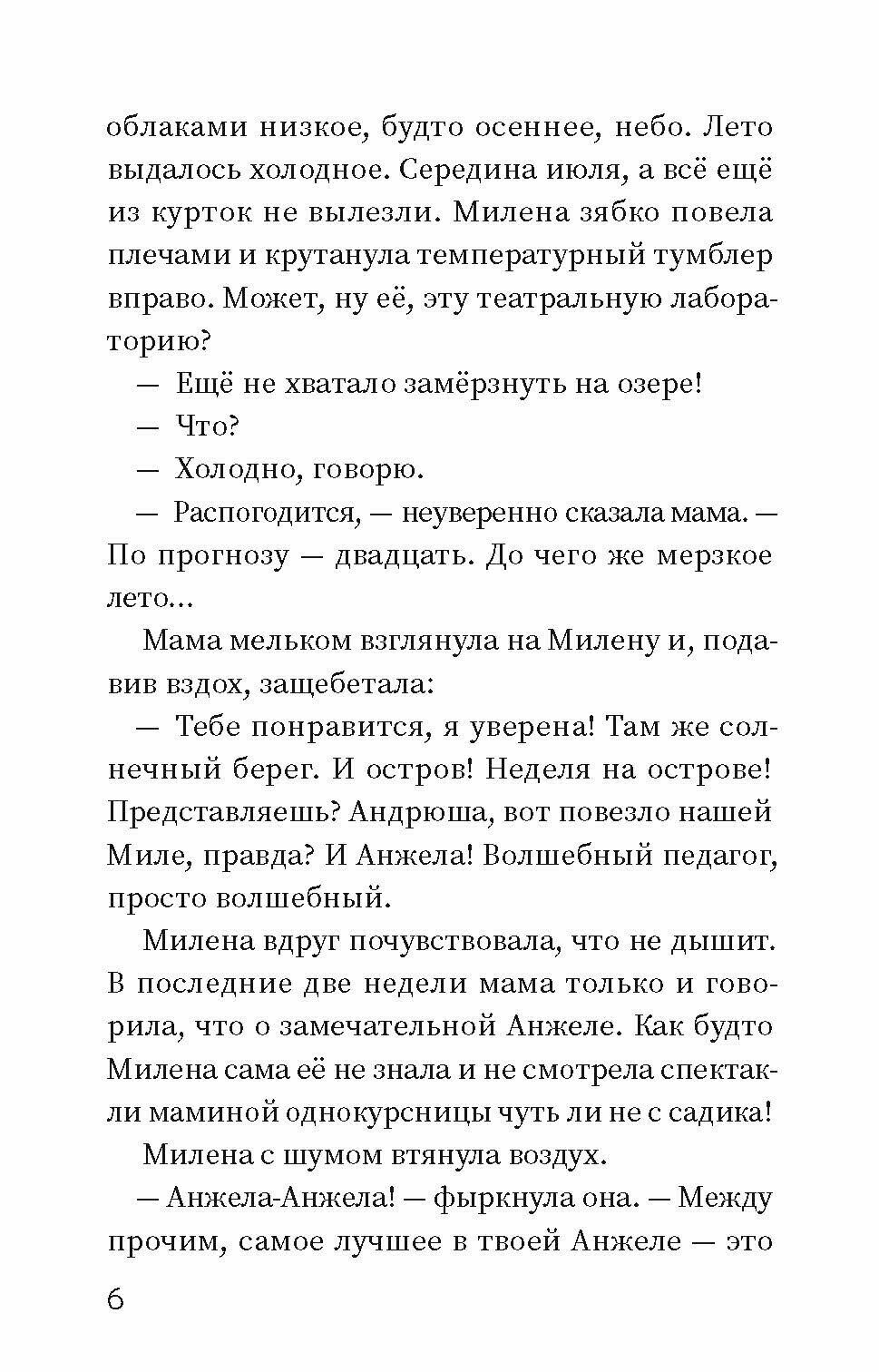 Лето Милены однозначно испорчено: мало того что она рассорилась с лучшей подругой, так ещё и мама навязала ей какую-то творческую лабораторию. Богом забытый остров, кругом одни театралы, и каждый из них мечтает стать знаменитым актёром. Поэтому все тут же бросаются выполнять любое, даже самое странное задание Анжелы - руководителя студии. То молча бродят по острову, то разговаривают с деревьями… Ну какой в этом смысл, и где логика? Но, кажется, не всё так безнадёжно. Симпатичный фотограф Фёдор помогает Милене освоиться. С ним интересно - может, стоит ему довериться?
