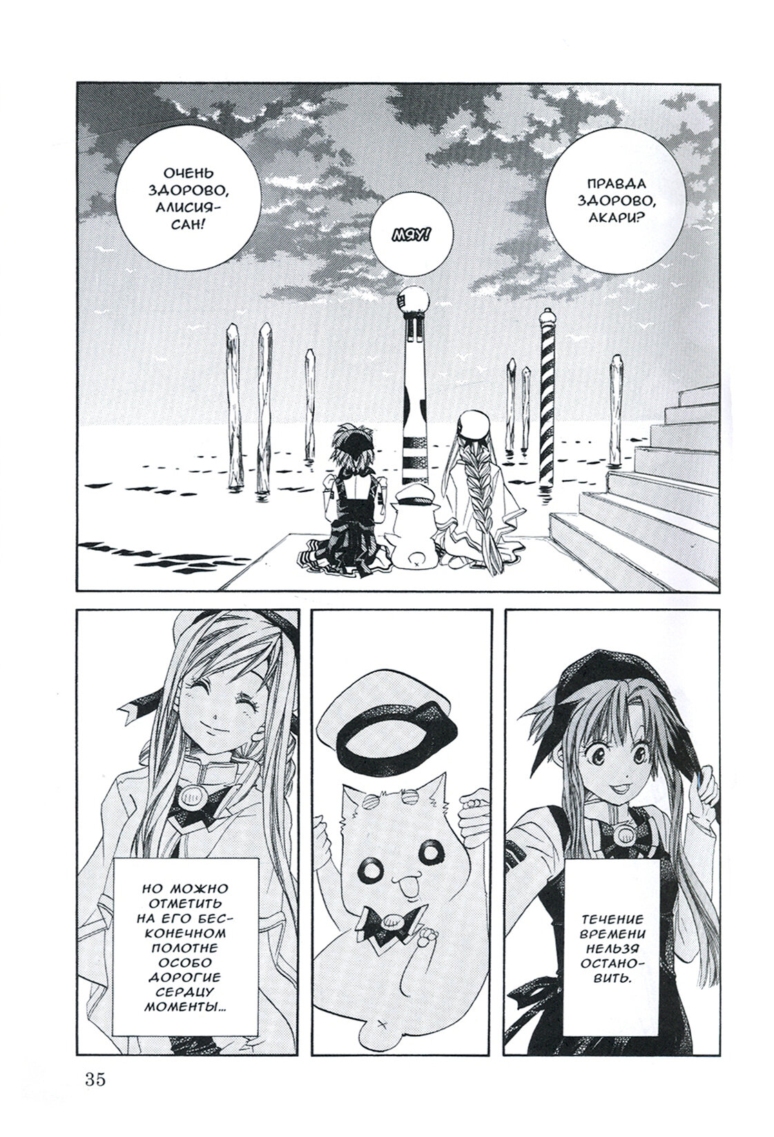 Шестой том чудесной манги Кодзуэ "Ария", мне нравится, пожалуй, больше всего, поэтому я была рада приобретению. Сюжет терраформирования и новой Венеции весьма интересен, правда не буду отрицать, что манга слишком повседневна. Ундины весьма меловидны и причины внешне, поэтому читать было сплошное удовольствие. Конечно, некоторых персонажей не до конца раскрыли, надеюсь в следующем томе им уделят больше внимания. Рисовки манга весьма милая, цветные иллюстрации радуют глаз. Поэтому я рекомендую к прочтению!