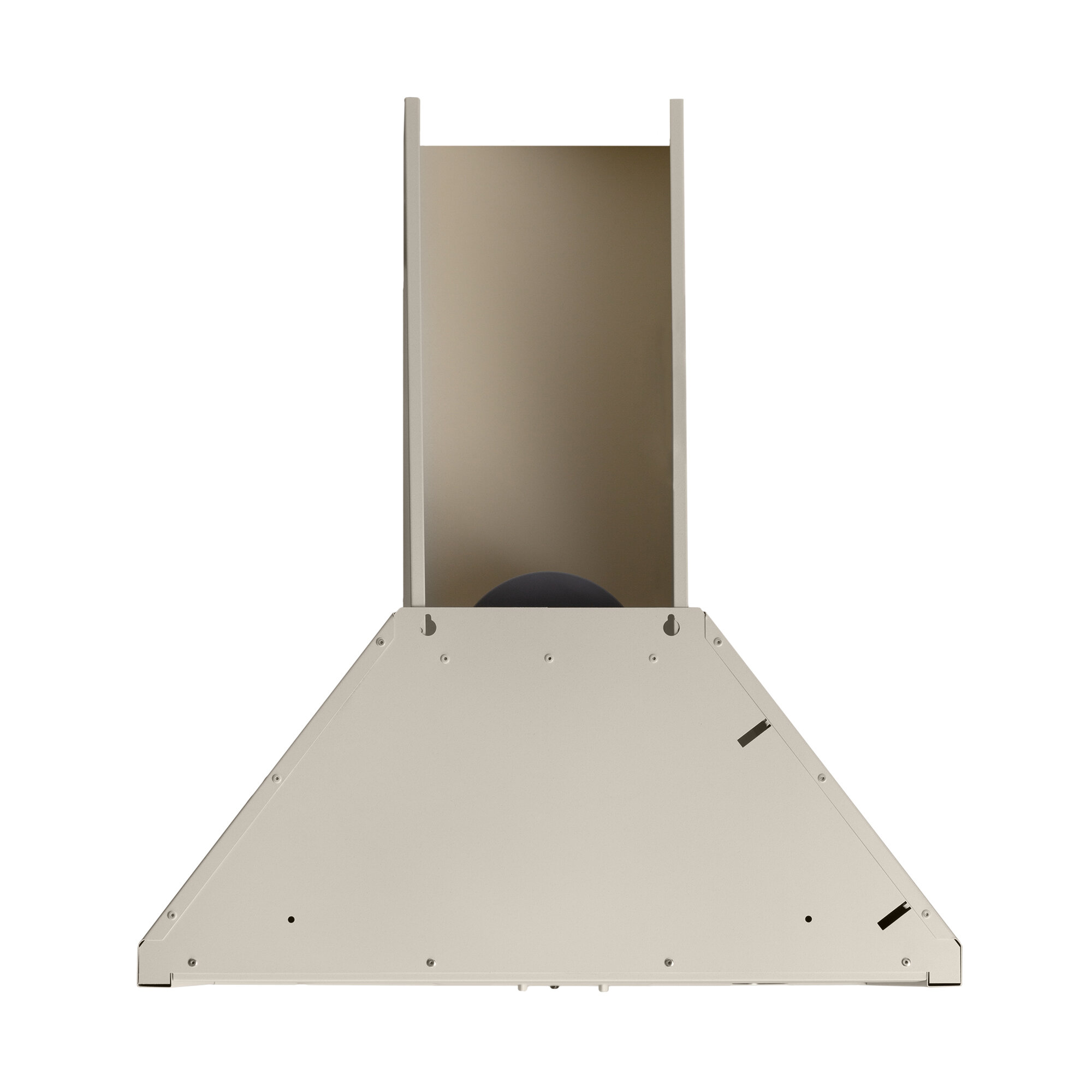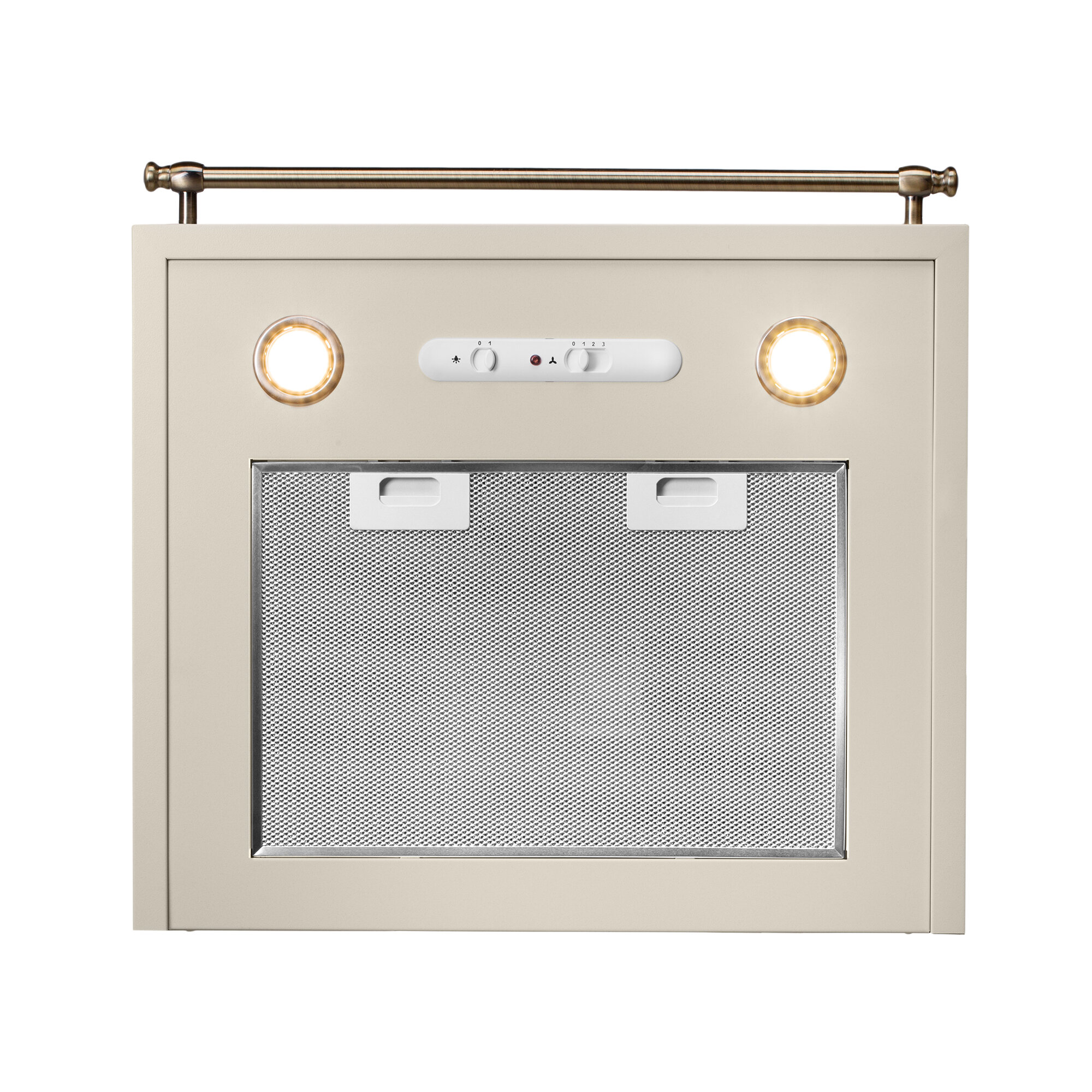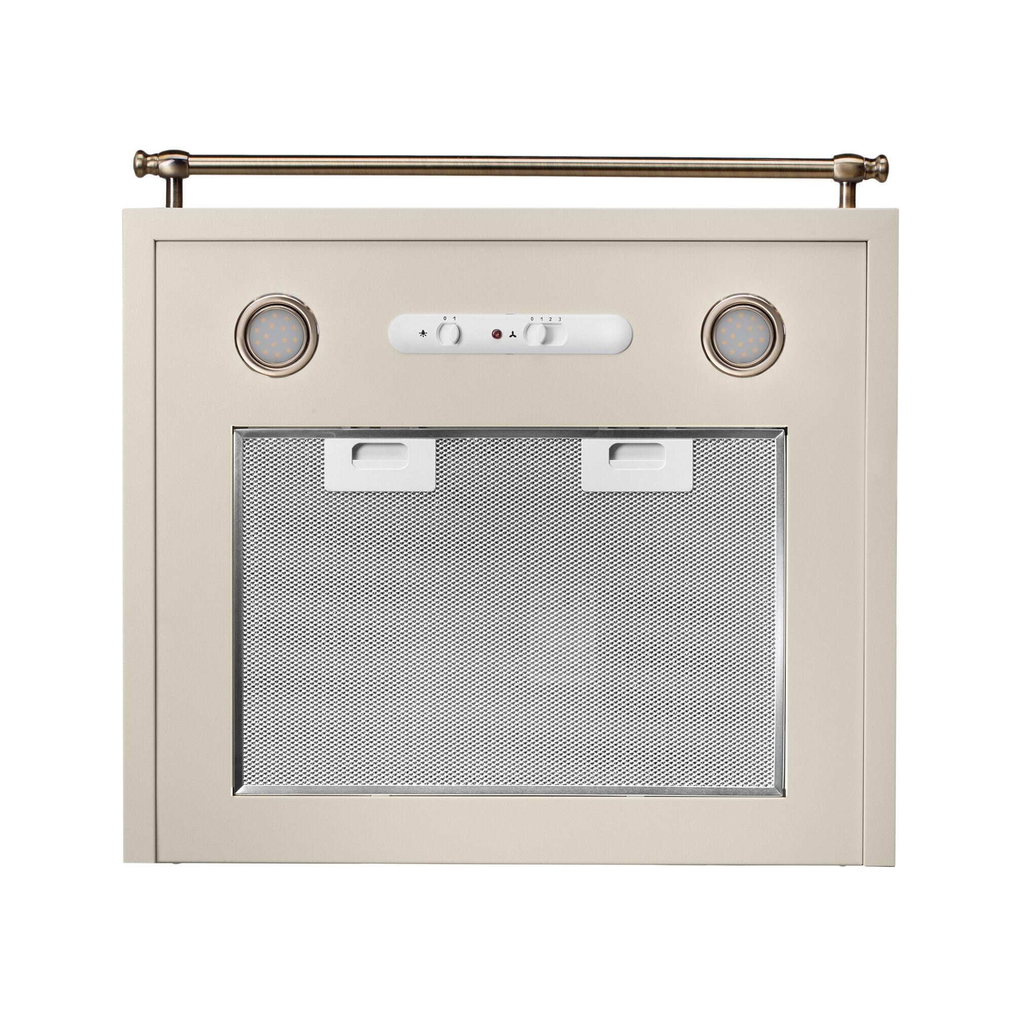 Эта классическая каминная вытяжка выполнена в бежевом цветовом исполнении с горизонтальным ограничительным карнизом, окрашенным под бронзу.