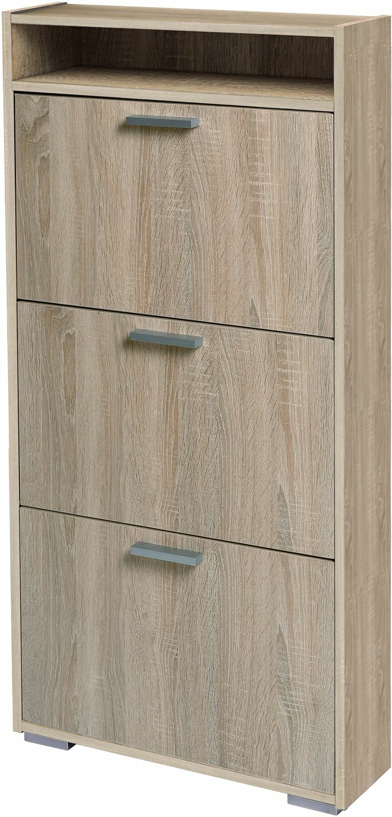 Напольная обувница поможет сделать хранение обуви в прихожей аккуратным и компактным. Модель имеет небольшую глубину (17,2 см), при этом вмещает в себя 9 пар туфель, кроссовок или ботинок. Корпус и откидные фасады выполнены из матовой ламинированной плиты, расцветка и текстурный рисунок которой имитируют натуральное дерево. На дверцах установлены широкие мебельные ручки металлического цвета, что обеспечивает быстрый и удобный доступ к обуви. В верхней части конструкции предусмотрена небольшая ниша для хранения различных мелочей, которые важно всегда держать под рукой.