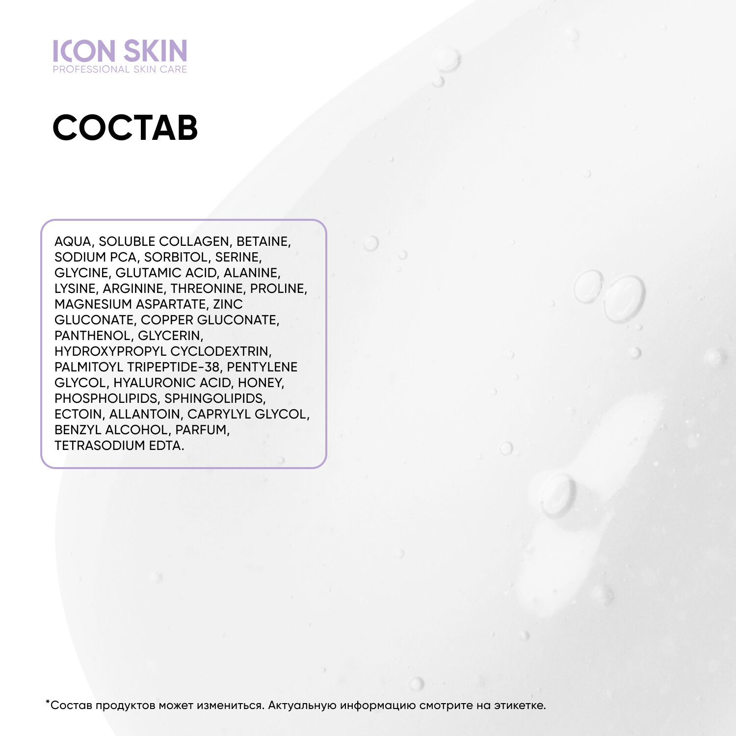 Состав: Aqua, Soluble Collagen, Betaine, Sodium Pca, Sorbitol, Serine, Glycine, Glutamic Acid, Alanine, Lysine, Arginine, Threonine, Proline, Magnesium Aspartate, Zinc Gluconate, Copper Gluconate, Panthenol, Glycerin, Hydroxypropyl Cyclodextrin, Palmitoyl Tripeptide-38, Pentylene Glycol, Hyaluronic Acid, Honey, Phospholipids, Sphingolipids, Ectoin, Allantoin, Caprylyl Glycol, Benzyl Alcohol, Parfum, Tetrasodium Edta