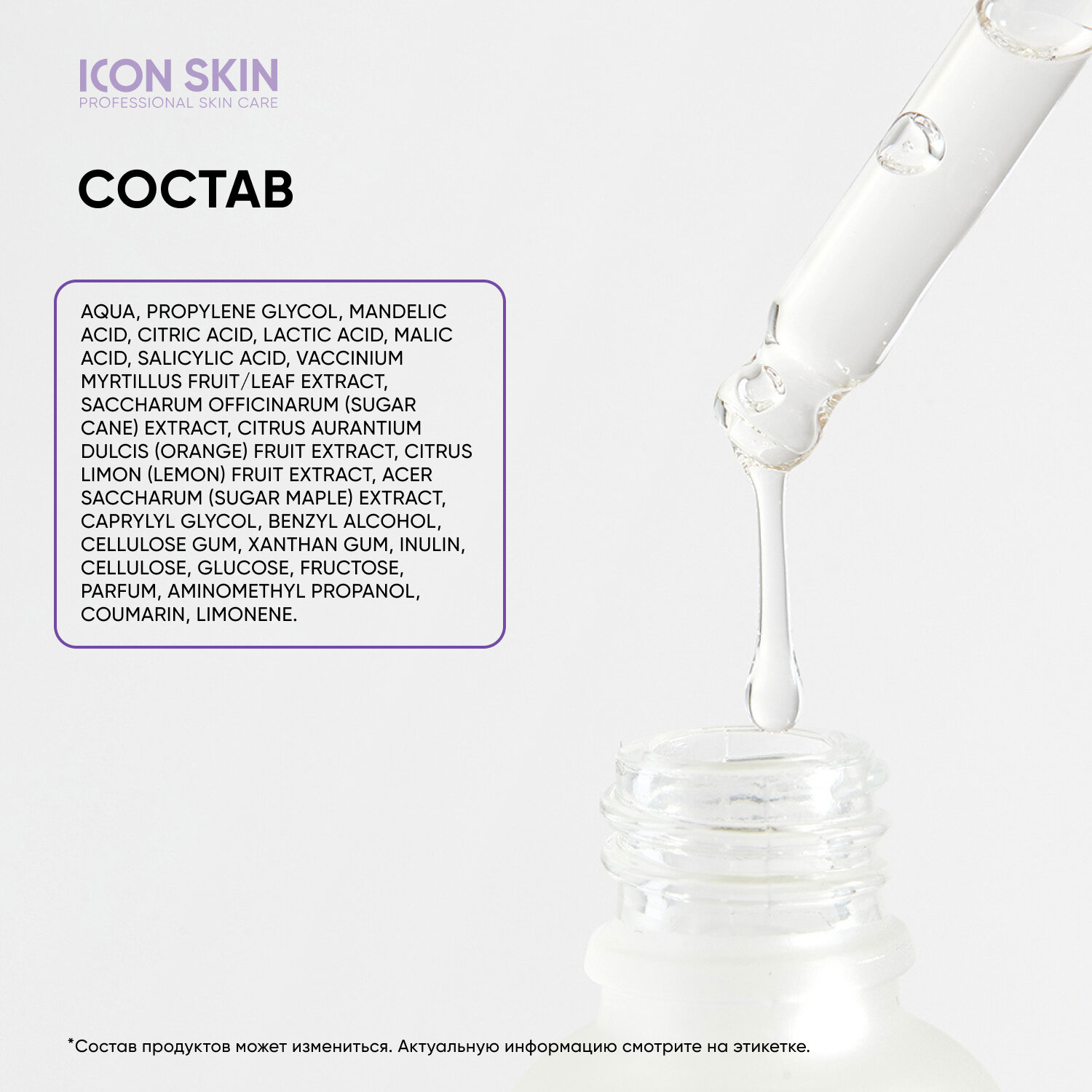 Состав: Aqua, Propylene Glycol, Mandelic Acid, Citric Acid, Lactic Acid, Malic Acid, Salicylic Acid, Vaccinium Myrtillus Fruit/leaf Extract, Saccharum Officinarum (sugar Cane) Extract, Citrus Aurantium Dulcis (orange) Fruit Extract, Citrus Limon (lemon) Fruit Extract, Acer Saccharum (sugar Maple) Extract, Caprylyl Glycol, Benzyl Alcohol, Cellulose Gum, Xanthan Gum, Inulin, Cellulose, Glucose, Fructose, Parfum, Aminomethyl Propanol