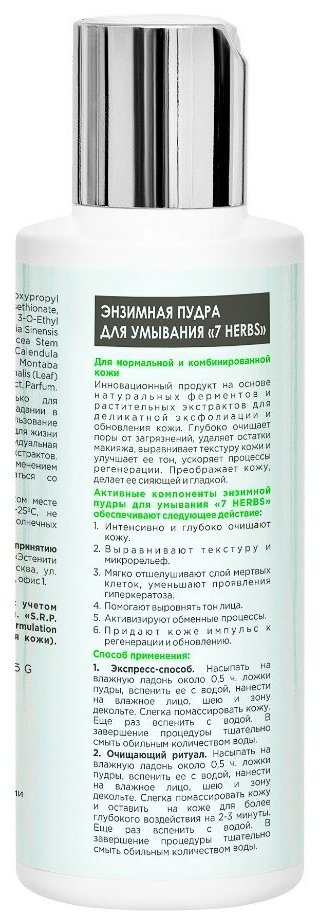 Состав: Hydroxypropyl Starch Phosphate, Sodium Cocoyl Isethionate, Kaolin, Ascorbic Acid, Bromelain, Papain Enzyme, Lauroyl Lysine, Camellia Sinensis (green Tea) Leaf Extract, Bambusa Vulgaris (bamboo) Leaf Extract, Betula Alba Leaf Extract, Calendula Officinalis Flower Extract, Arnica Montana (arnica) Flower Extract, Melissa Officinalis Leaf Extract, Salix Alba Bark Extract, Parfum