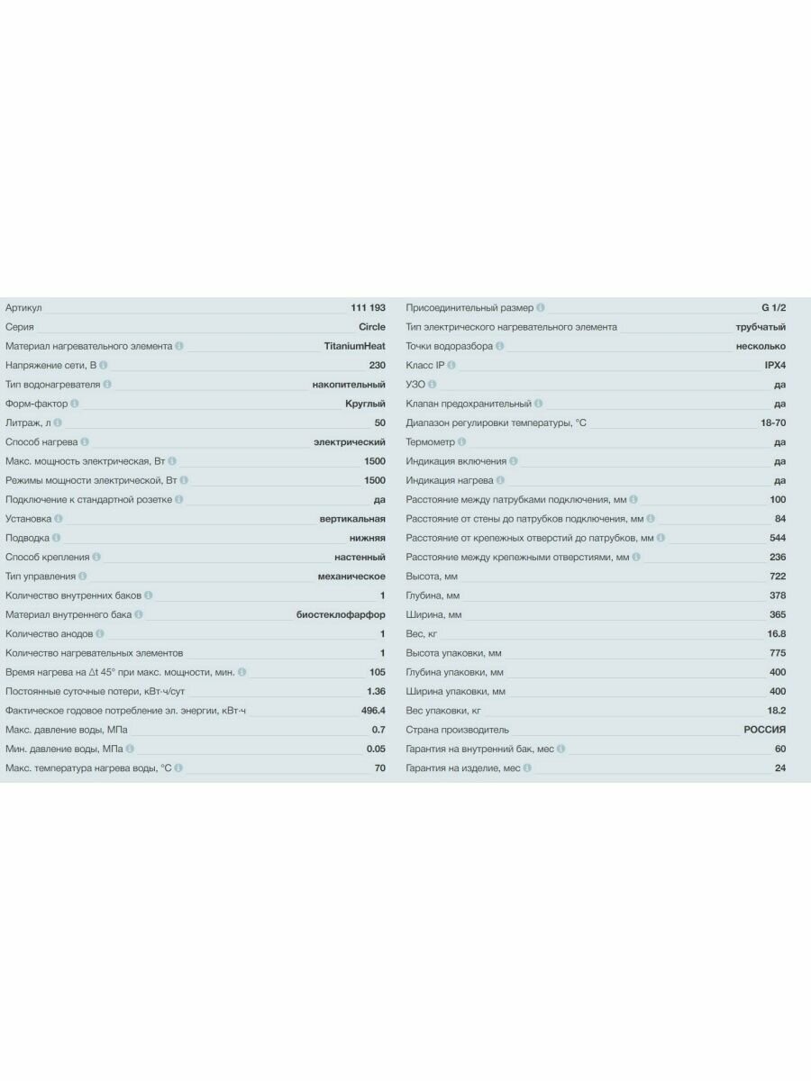 | Прочие особенности и свойства | Максимальная температура воды 70 °C, Внутреннее покрытие бака биостеклофарфор, Время нагрева - 105 мин / при ?t=45 °С / |