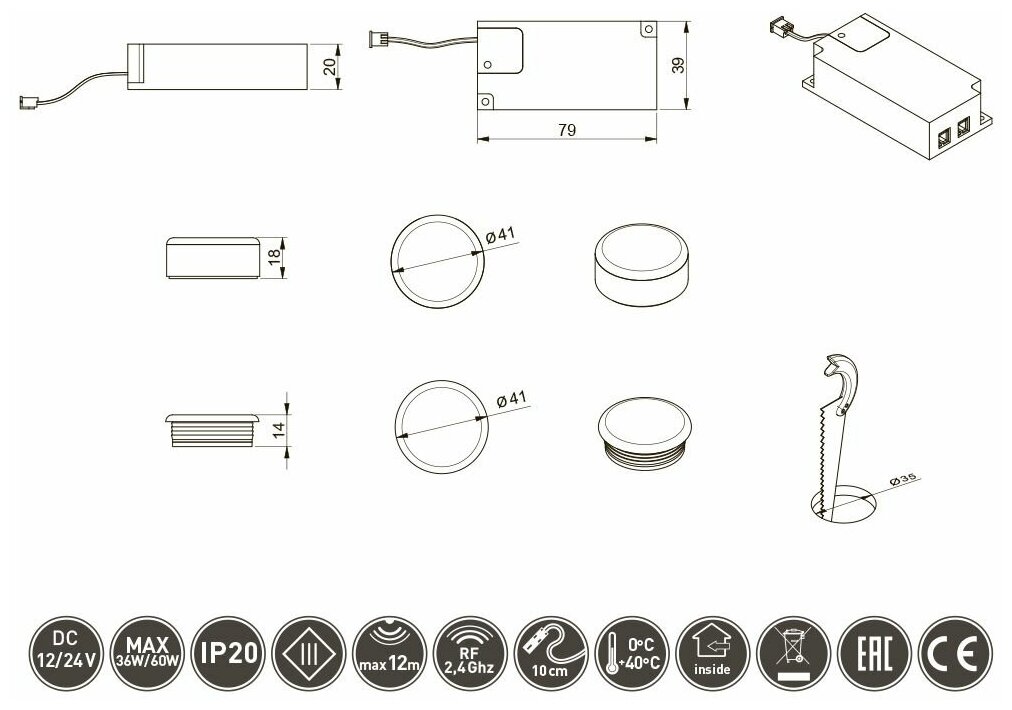 Выключатель (2 кнопки: 1) вкл./выкл./диммирование, 2) регулировка цветовой температуры) - 1 шт.