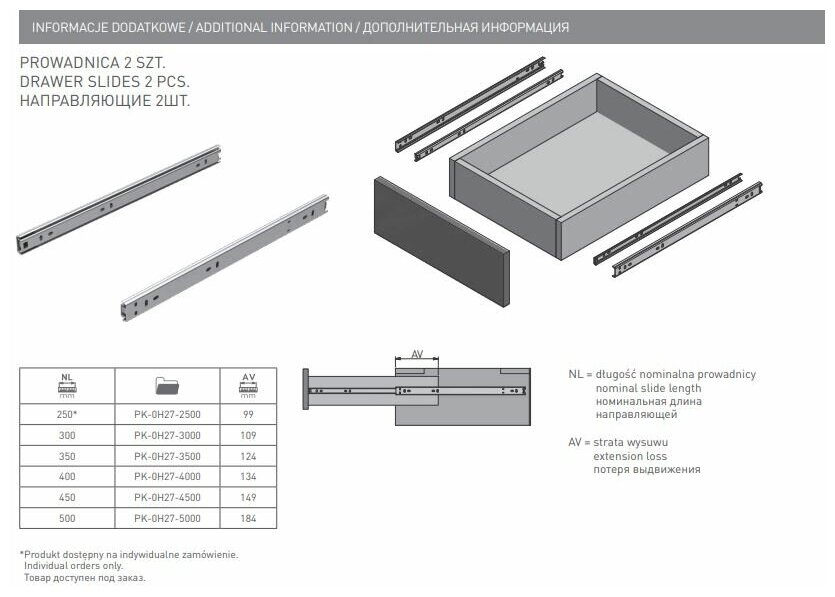 Направляющие шариковые неполного выдвижения 27/450 GTV (PK-0H27-4500)