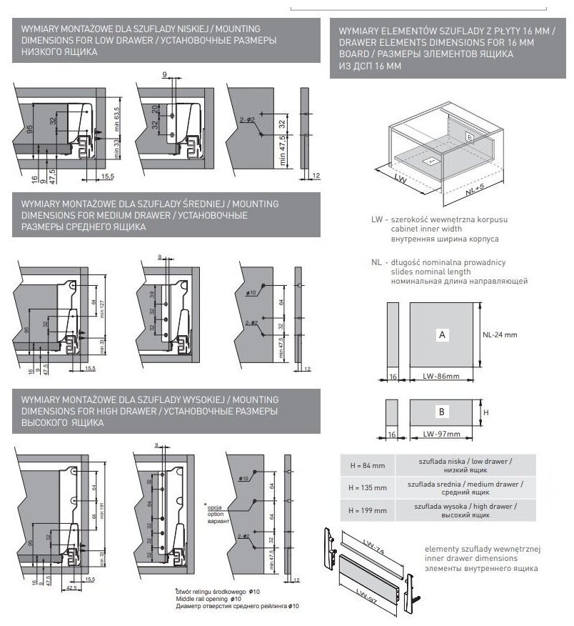 При проектировании мебельного изделия необходимо учесть техническое примечание от производителя; для правильной работы направляющей рекомендованная ширина ящика не должна превышать номинальной длины направляющей. Для данной модели номинальная длина направляющих = 450 мм.