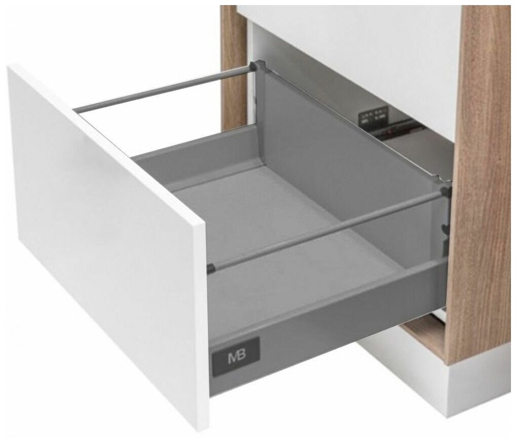 Модерн Бокс push to open L-450 высокий, серый (1 рейлинг) - мебельная система выдвижения, представляющая собой набор из направляющих, боковых стенок и рейлингов, для сборки выкатного ящика. Модерн Бокс в первую очередь предназначен для кухонных гарнитуров, но также может быть использован в мебельных конструкциях другого назначения, где конструктивно предусмотрены выдвижные ящики.