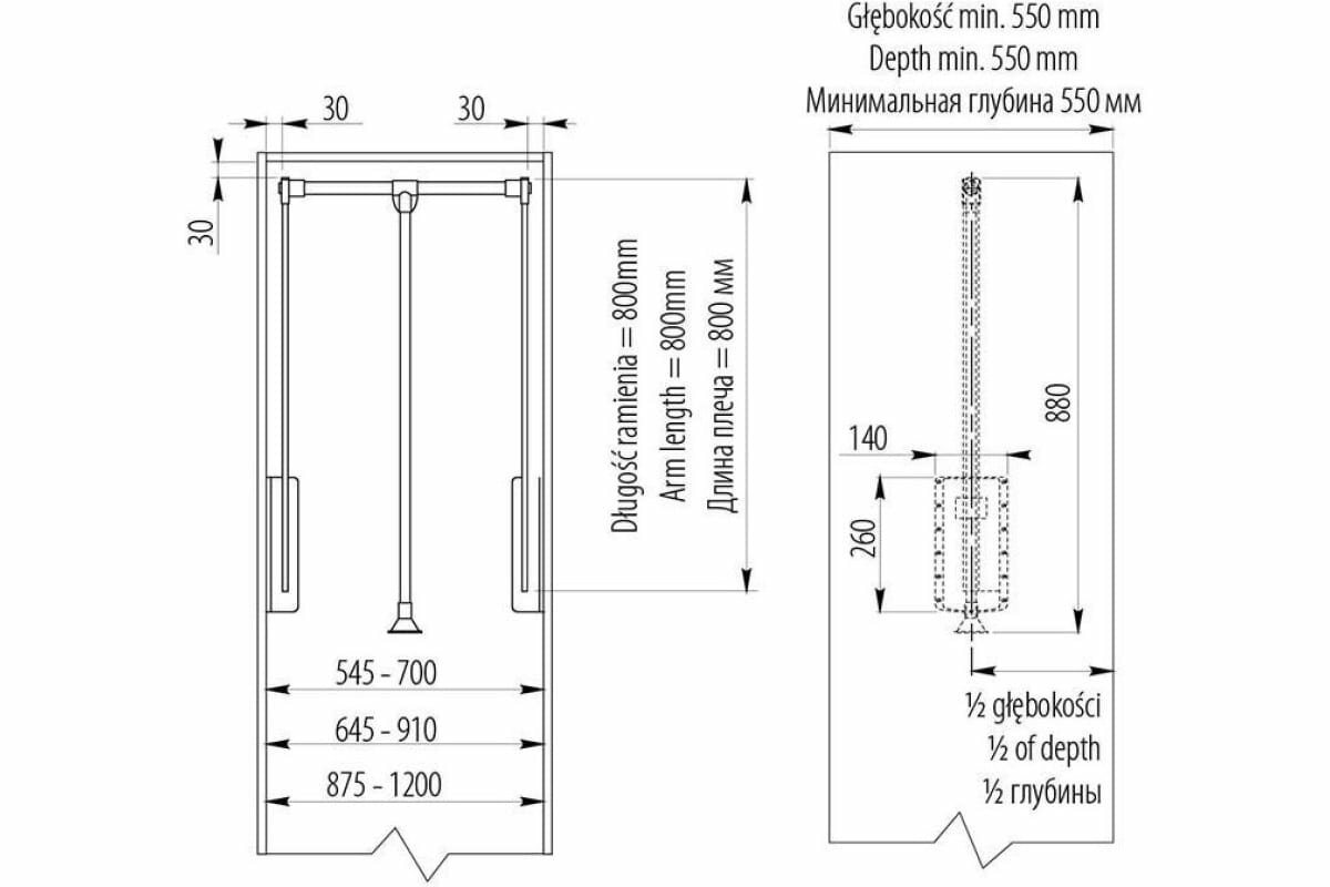 Телескопическая штанга перед установкой в шкаф регулируется в пределах 60-83 см.