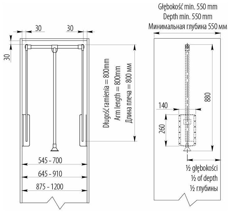 Телескопическая штанга перед установкой в шкаф регулируется в пределах 45-60 см.