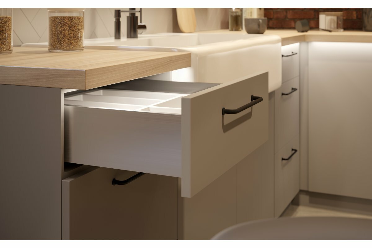 Максимальная вместимость ящика, достигнутая посредством нижнего монтажа направляющих и минимальной толщины боковых панелей.