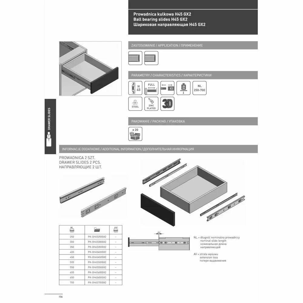 Направляющие шариковые полного выдвижения GX2 40/400 мм GTV (PK-0H45400GX2-A)