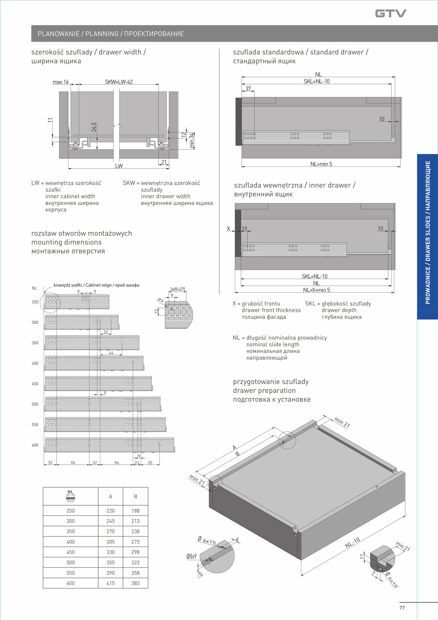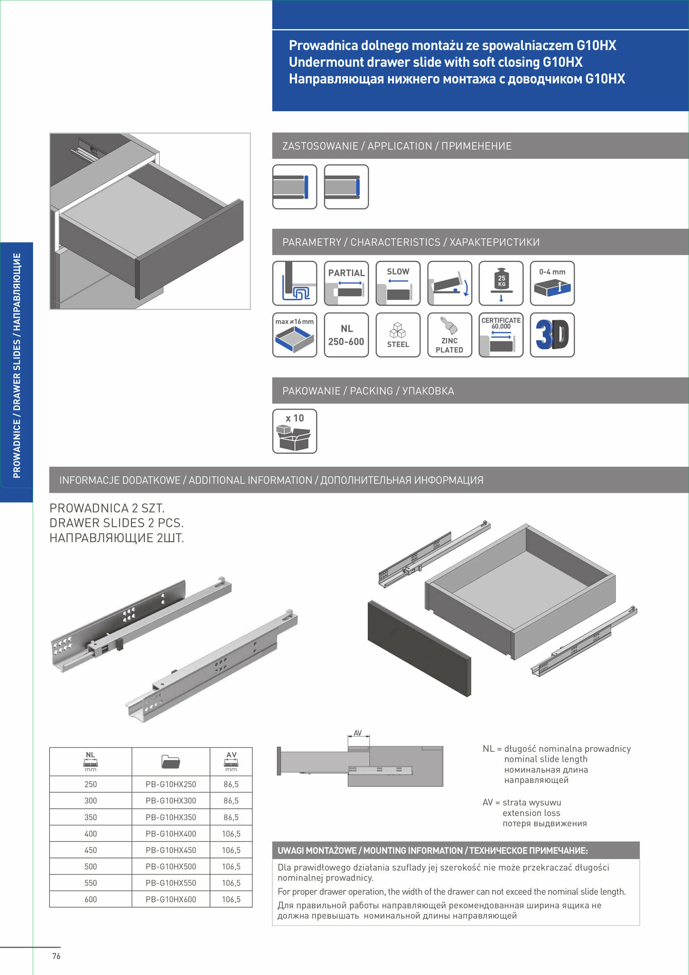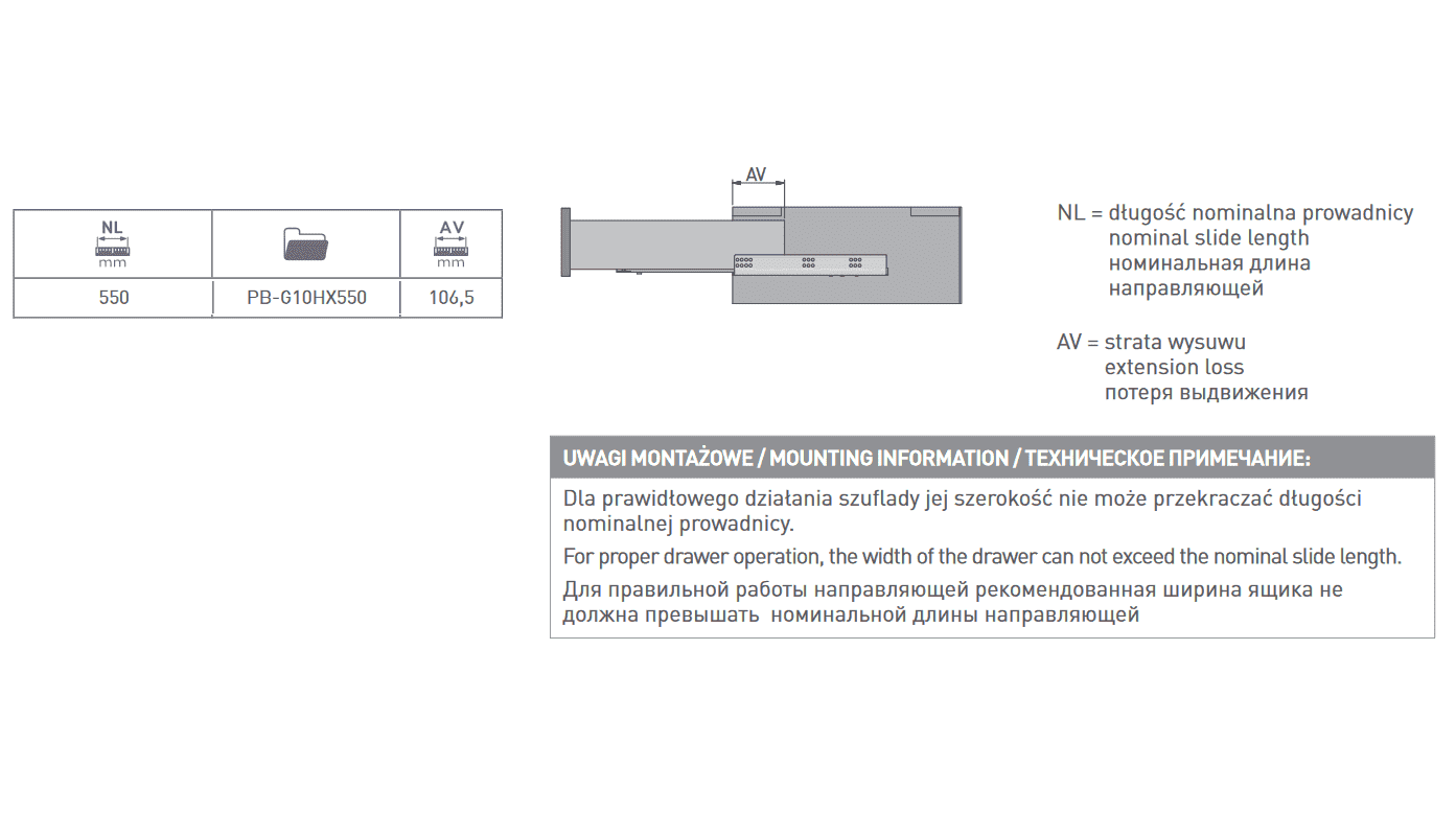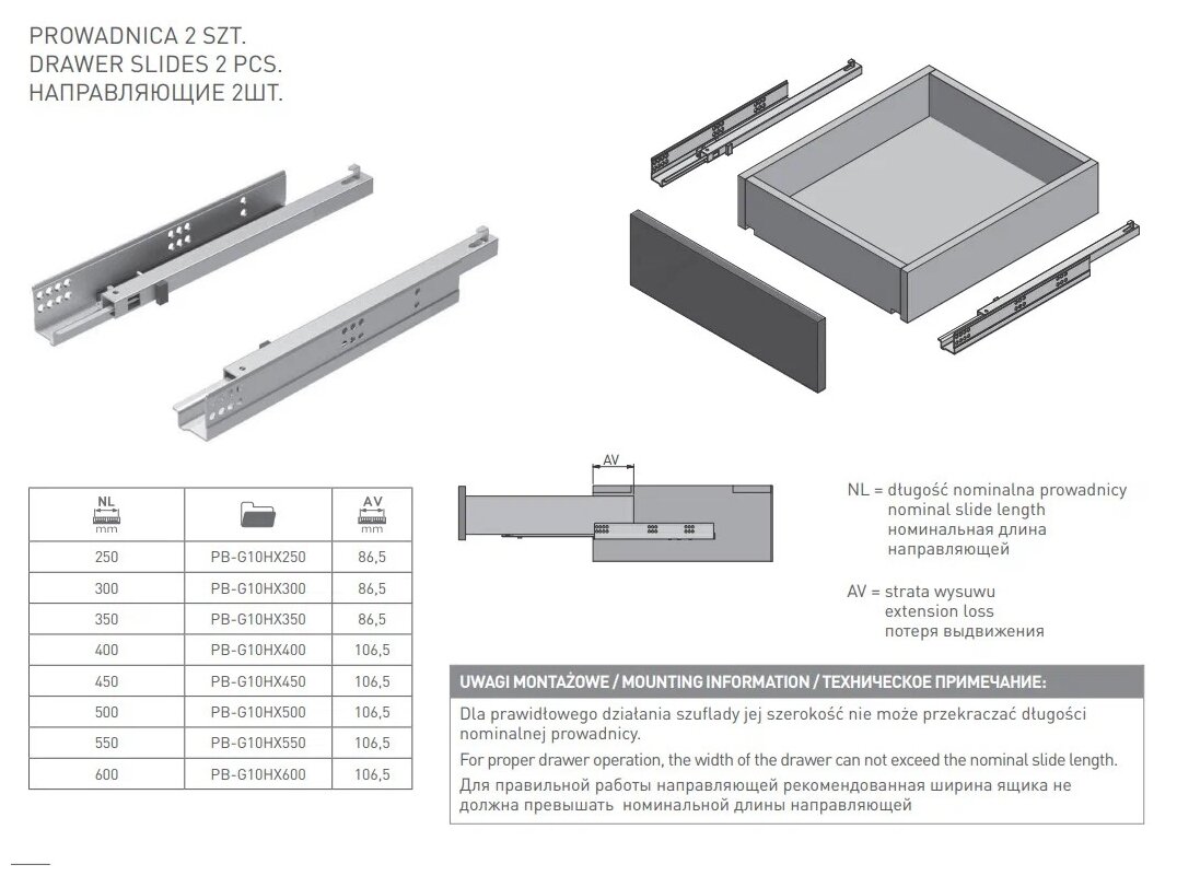 Направляющие MODERN SLIDE не полного 3/4 выдвижения L-600 для деревянных ящиков с доводчиком без крепления к фасаду GTV (PB-G10HX600-H)