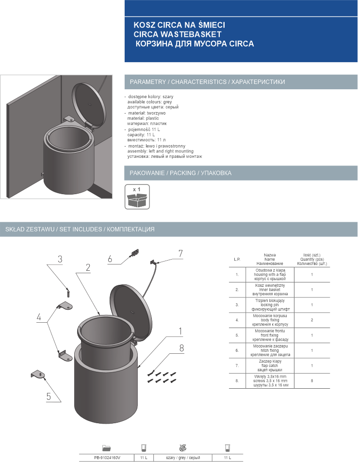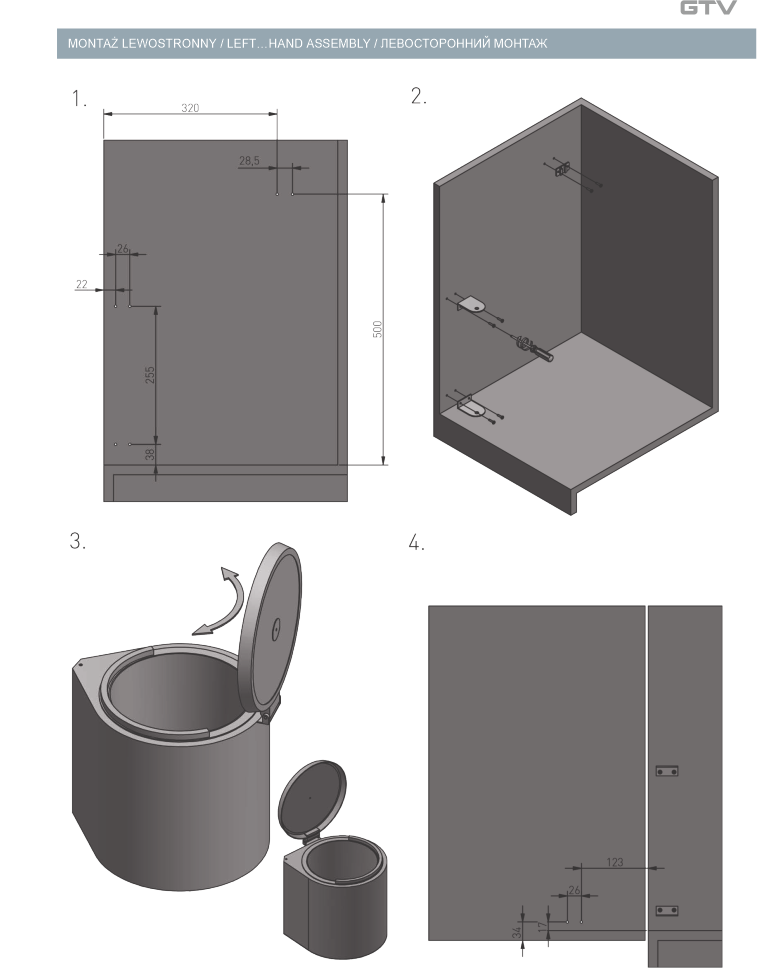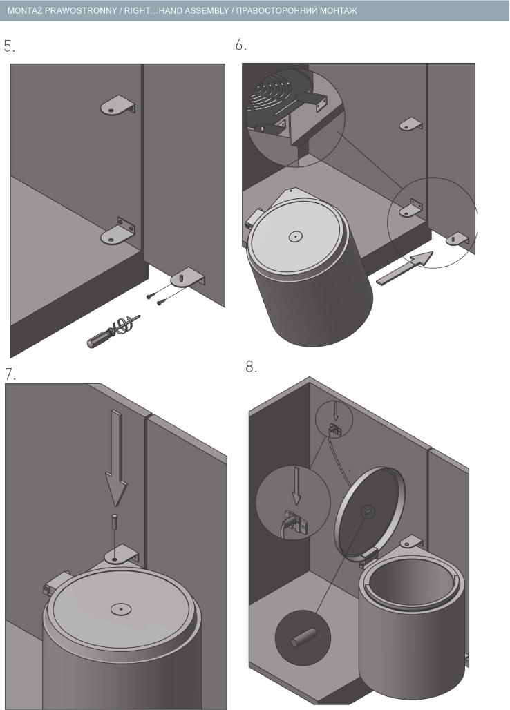 Ведро может быть установлено в шкафчике как с левой, так и с правой стороны.