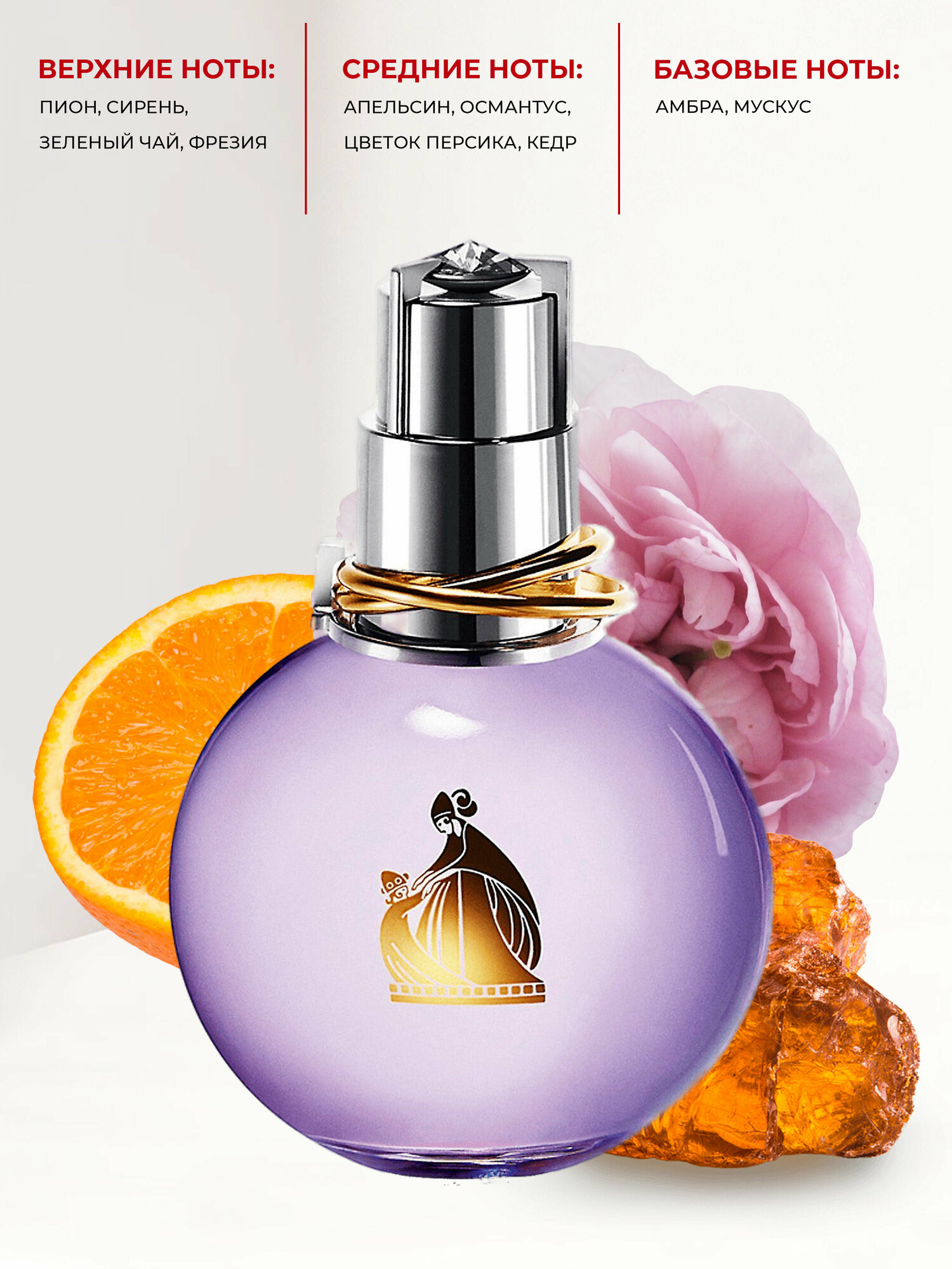 Год выпуска: 2006 Производство: Франция Семейство: цветочные зеленые Верхние ноты: зеленая сирень, Петит-грейн Средние ноты: Османтус, Пион, цветы персика, чай, вистерия Базовые ноты: Белый кедр, Мускус, Амбра Роскошная женская туалетная вода Эклат Ланвин полна чистоты, романтики и очарования. Чувственный и нежный прозрачный цветочный букет притягивает своей утонченностью и стойкостью. В начальных аккордах слышна сирень, китайский османтус и лимон, маня весенним пробуждением. Сердце раскрывается пышно-цветущим пионом, глицинией и бархатным персиком. Зеленый чай Эйри образует прозрачный шлейф, переплетаясь с белым кедром, драгоценным янтарем и мускусом.
