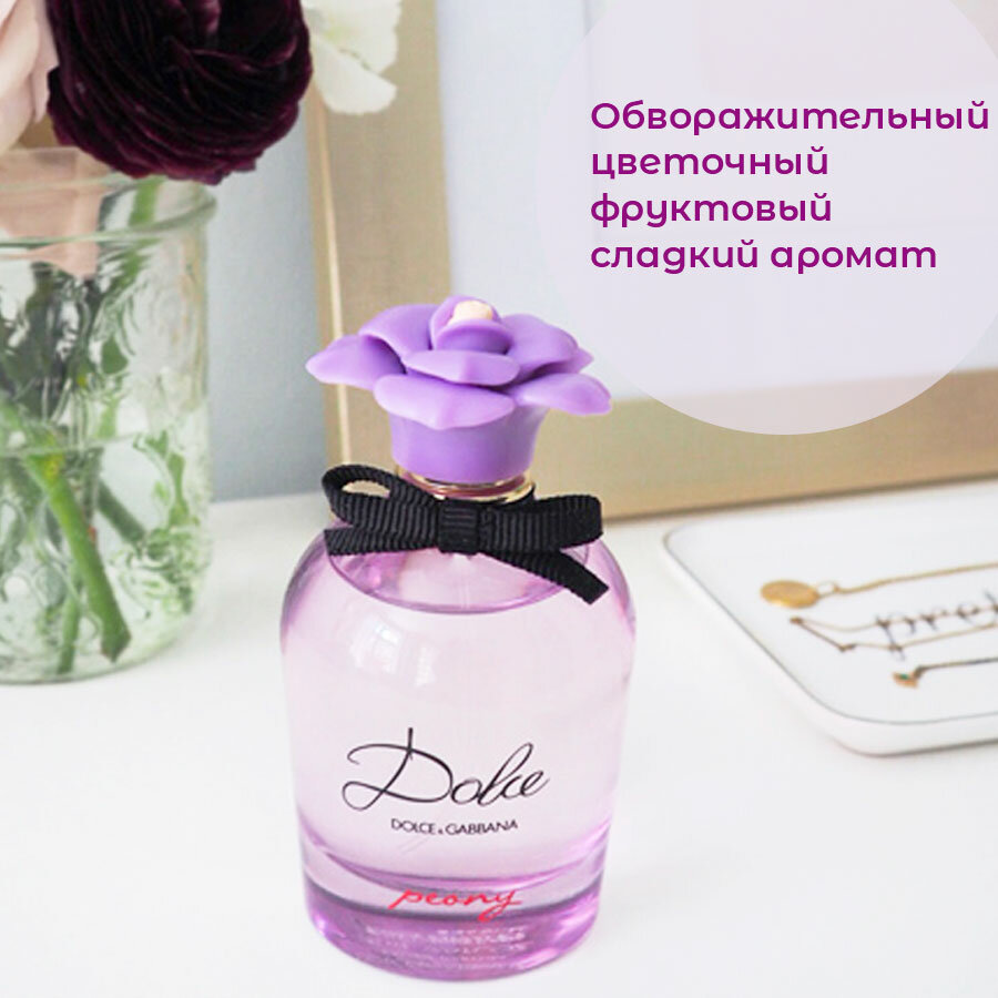 Парфюмерная вода Dolce&Gabbana; Dolce Peony для дополнения образа человека приятным ароматом. Парфюм стойко держится на одежде около 10 часов после нанесения, оставляя приятный шлейф. Компактный флакон не займет много места на туалетном столике. Объема в 50 мл будет достаточно чтобы понять, подходит это сочетание ароматов в повседневном или вечернем образе. На флаконе нанесено название и бренд парфюма.