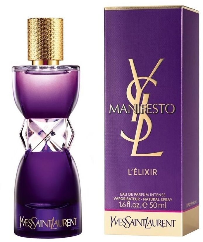 Yves Saint Laurent - Manifesto l'Elixir – женская парфюмированная вода от французской модной фирмы Yves Saint Laurent, изданная в 2013 году в продолжение линии Manifesto. Многогранные духи из группы восточных цветочных ароматов окутывают своих обладательниц насыщенной атмосферой страстности, вдохновения и творчества. Героини аромата Manifesto l'Elixir чувственны и прелестны, эротичны и оригинальны, индивидуальны и обаятельны. Ориентальное издание помещено в изящный сине-фиолетовый флакончик, увенчанный золотой крышечкой и декорированный по центру «поясом» граненого переливающегося стекла. Композиция Yves Saint Laurent - Manifesto l'Elixir слышится верхними нотами мандарина и бергамота; сердечными нотами: туберозы, гелиотропа и арабского жасмина самбак; базовыми нотами: ванили, звука кашемирового дерева и тона молекулы ambroxan.