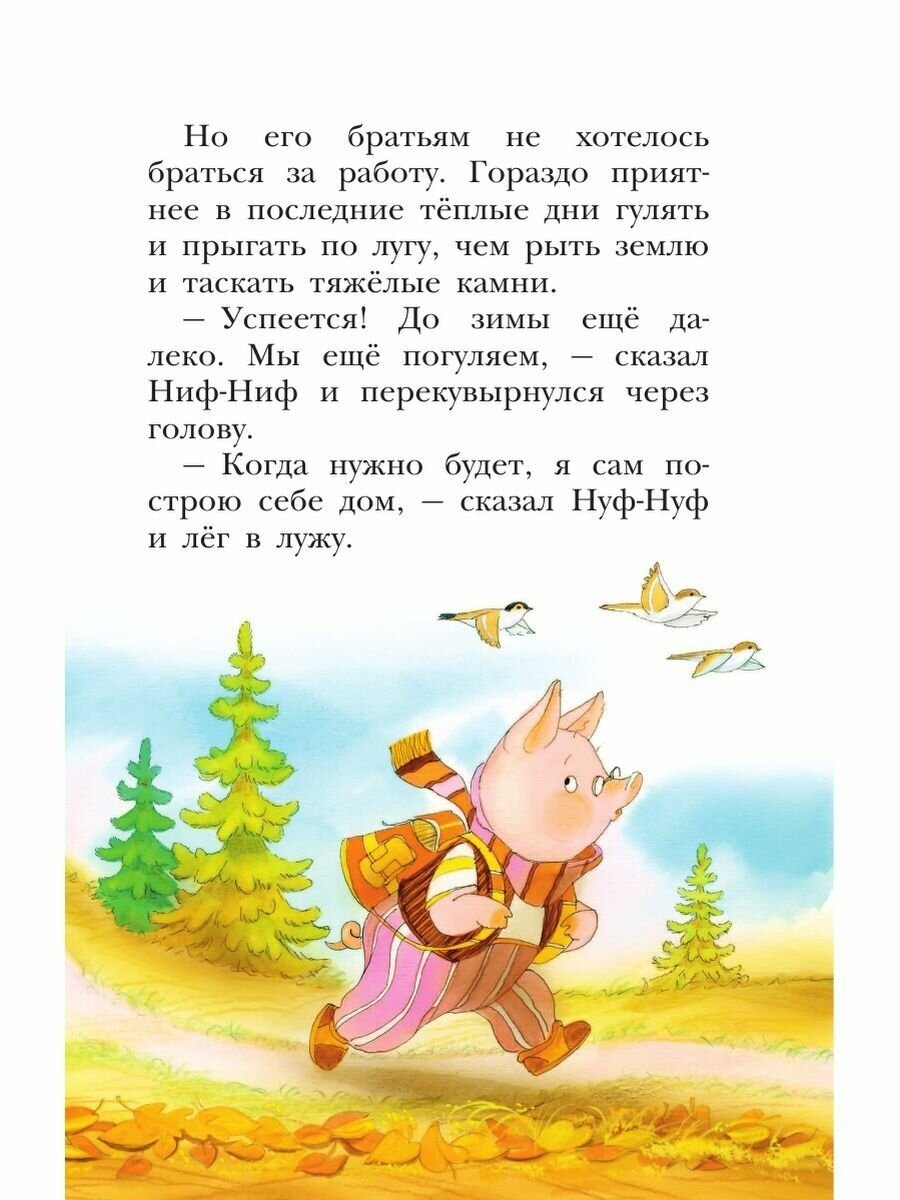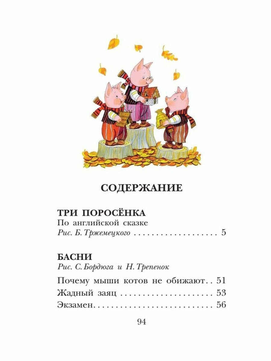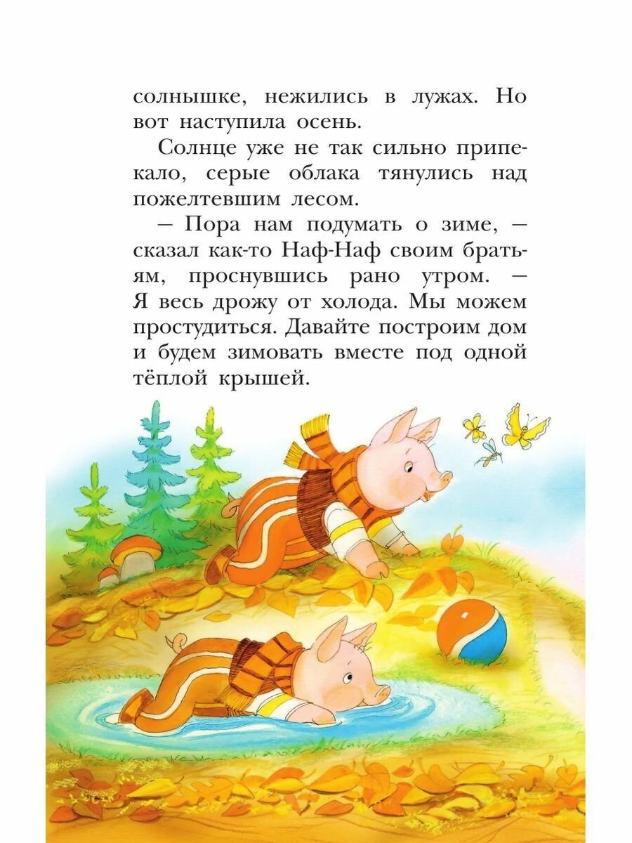 Почему-то в детстве я сама обожала эту историю про трёх поросят, конечно же свою дочь с этой историей я решила обязательно познакомить. Ребёнку очень понравилось слушать сказку про поросят, шрифт очень хороший, иллюстрации красочные и на каждой странице. Дополнительно идут басни, и немало, а именно 13 штук, но басни пока ребенок в два года без особого интереса слушает, но на будущее пригодится однозначно.