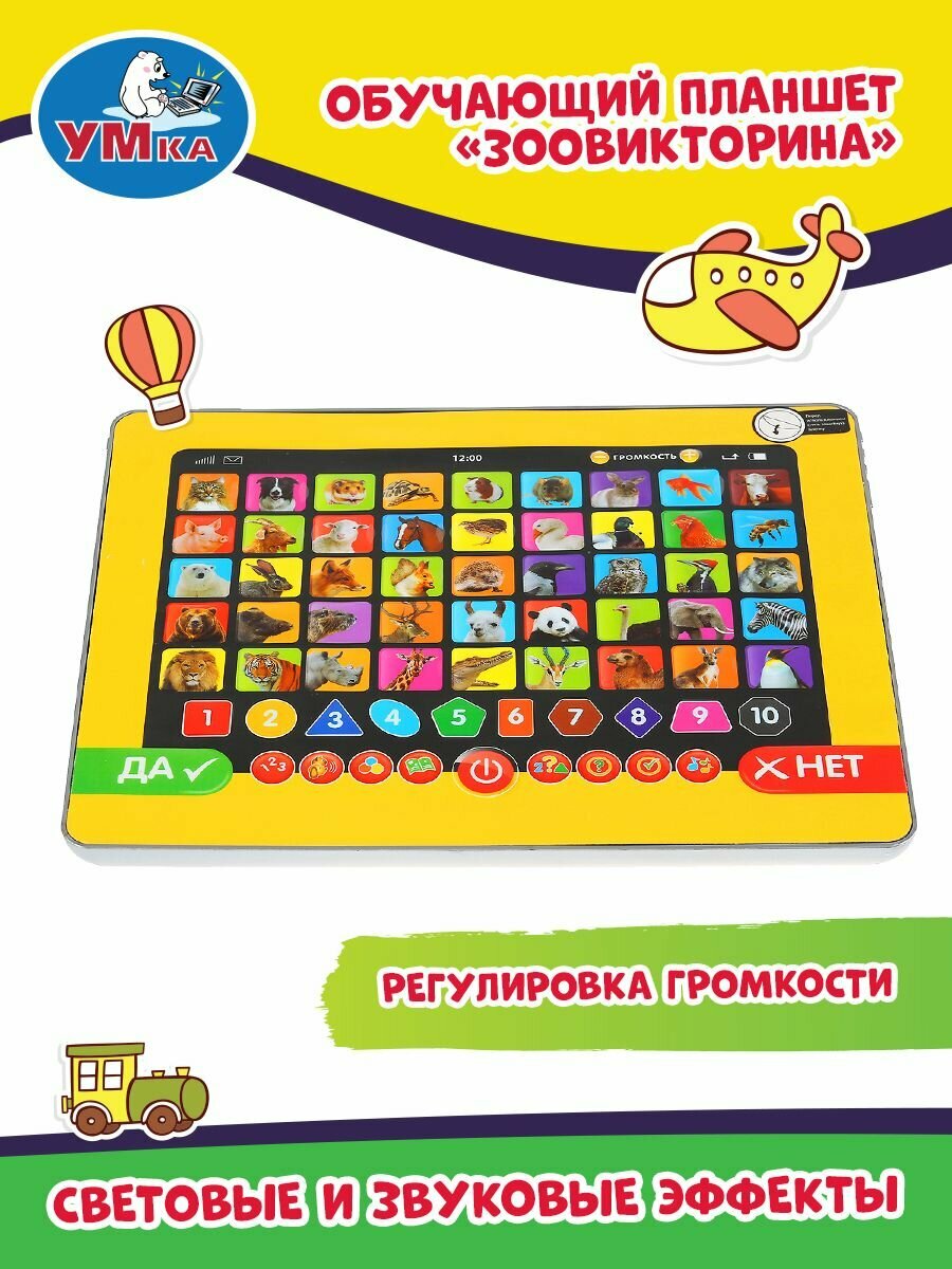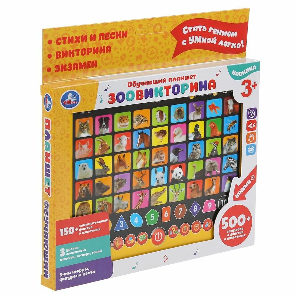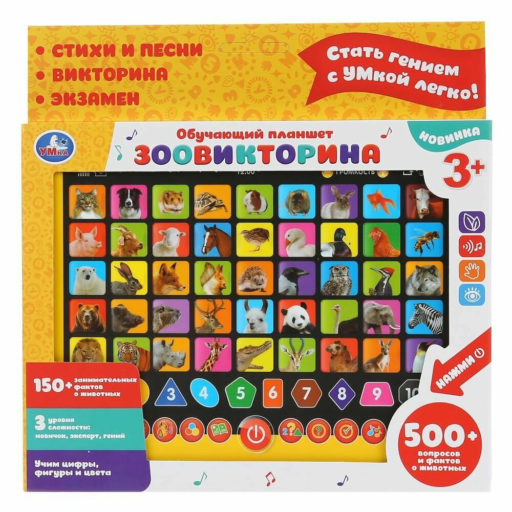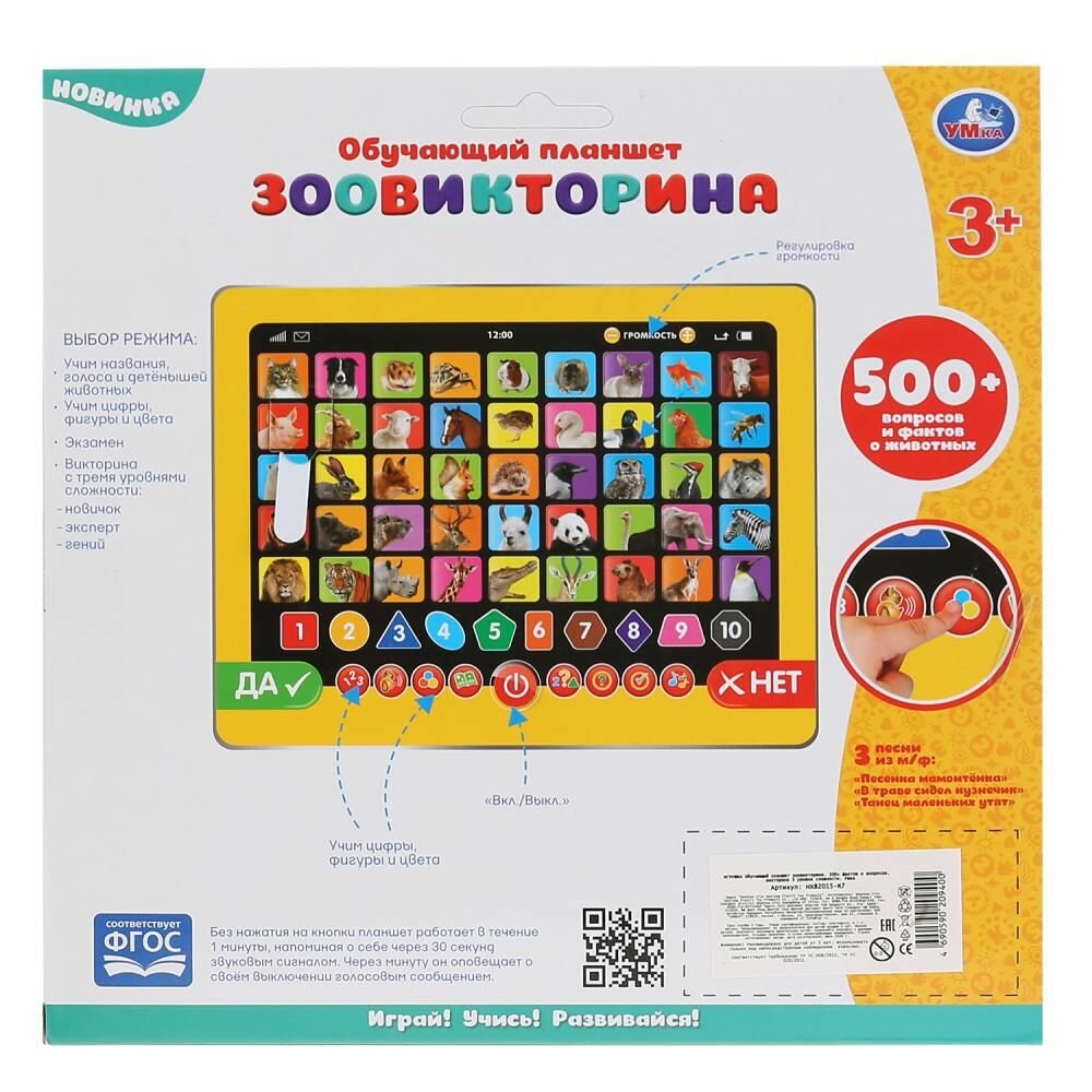Обучающий планшет «Зоовикторина» ТМ «УМка» – возможность обучаться в лёгком и ненавязчивом формате:- 500 вопросов и фактов о животных- 3 уровня сложности: новичок, эксперт и гений- обучение цифрам, фигурам и цветам- кнопки вкл./выкл, регулировки громкостиИгрушка-планшет – креативный, интересный и полезный подарок для развития и игры. Малыш познакомится с разными видами животных: узнает, кто что ест, где живёт и как разговаривает.Игра на планшете ТМ «УМка» способствует расширению кругозора и развивает:- звуковое восприятие и музыкальный слух- память- мелкую моторику- фантазиюРазмер: 18 х 13 х 2 см.Материал: пластмасса + металл.Укомплектовано 3 батарейками ААА.Рекомендуем детям от 3-х лет.