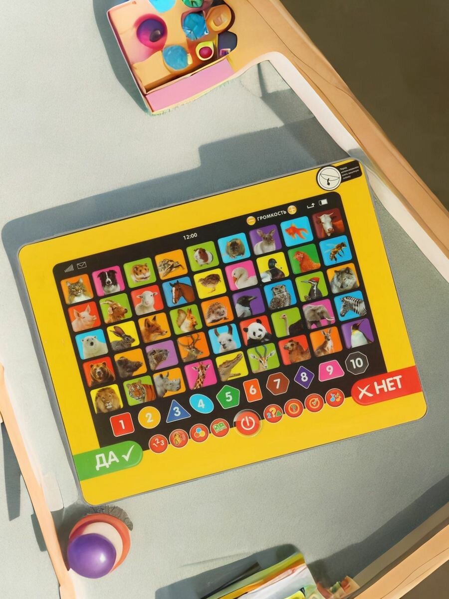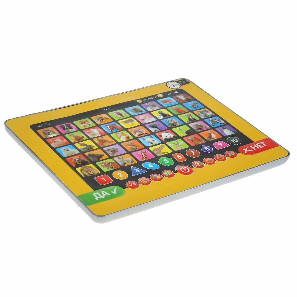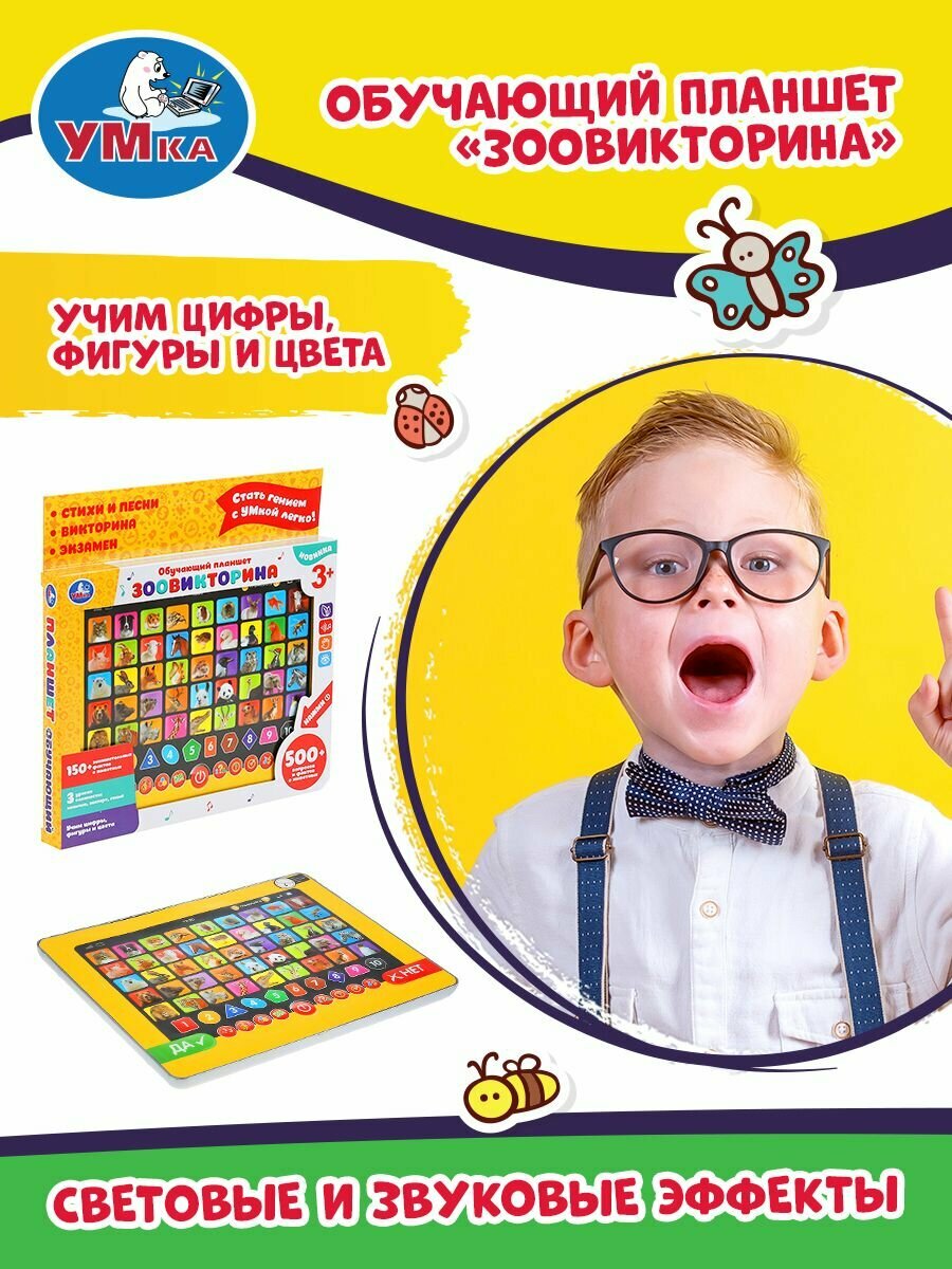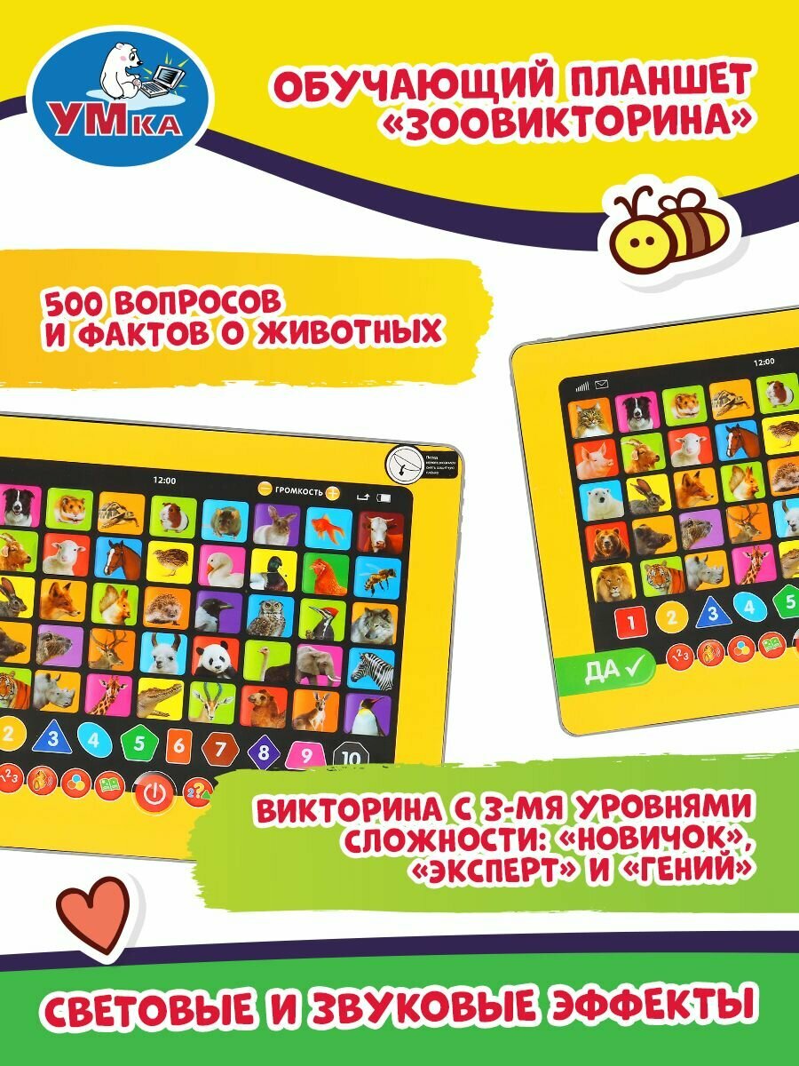 Обучающий планшет «Зоовикторина» ТМ «УМка» – возможность обучаться в лёгком и ненавязчивом формате:- 500 вопросов и фактов о животных- 3 уровня сложности: новичок, эксперт и гений- обучение цифрам, фигурам и цветам- кнопки вкл./выкл, регулировки громкостиИгрушка-планшет – креативный, интересный и полезный подарок для развития и игры. Малыш познакомится с разными видами животных: узнает, кто что ест, где живёт и как разговаривает.Игра на планшете ТМ «УМка» способствует расширению кругозора и развивает:- звуковое восприятие и музыкальный слух- память- мелкую моторику- фантазиюРазмер: 18 х 13 х 2 см.Материал: пластмасса + металл.Укомплектовано 3 батарейками ААА.Рекомендуем детям от 3-х лет.