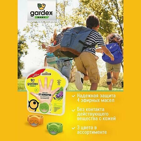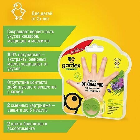Cредство снижает вероятность укусов комаров, мокрецов и москитов, подойдет для прогулок в парке или во дворе. Благодаря 100% натуральному составу из 4 эфирных масел, а также отсутствию контакта действующего вещества с кожей, браслет Gardex Baby от комаров для детей абсолютно безопасен. В комплекте с браслетом идут 2 сменных картриджа, каждый картридж сохраняет свое действие до 3 недель, а всего браслета хватит на 6 недель - весь срок активности комаров. Также картридж содержит горькую пищевую добавку, которая защитит малыша от его проглатывания.